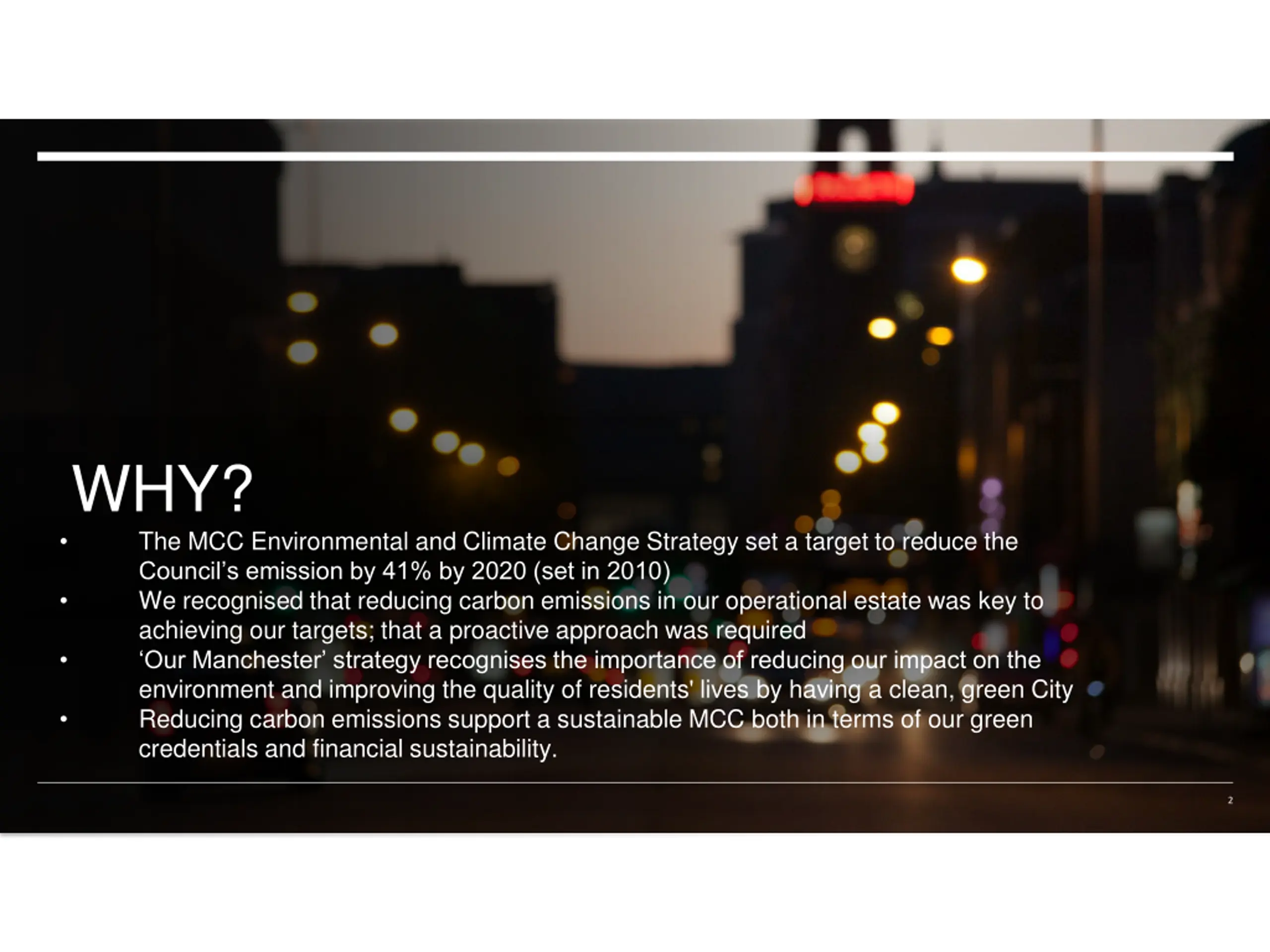 WHY? The MCC Environmental and Climate Change Strategy set a target to reduce the Council s emission by 41% by 2020 (set in 2010) We recognised that reducing carbon emissions in our operational estate was key to achieving our targets; that a proactive approach was required Our Manchester strategy recognises the importance of reducing our impact on the environment and improving the quality of residents' lives by having a clean, green City Reducing carbon emissions support a sustainable MCC both in terms of our green credentials and financial sustainability. 2