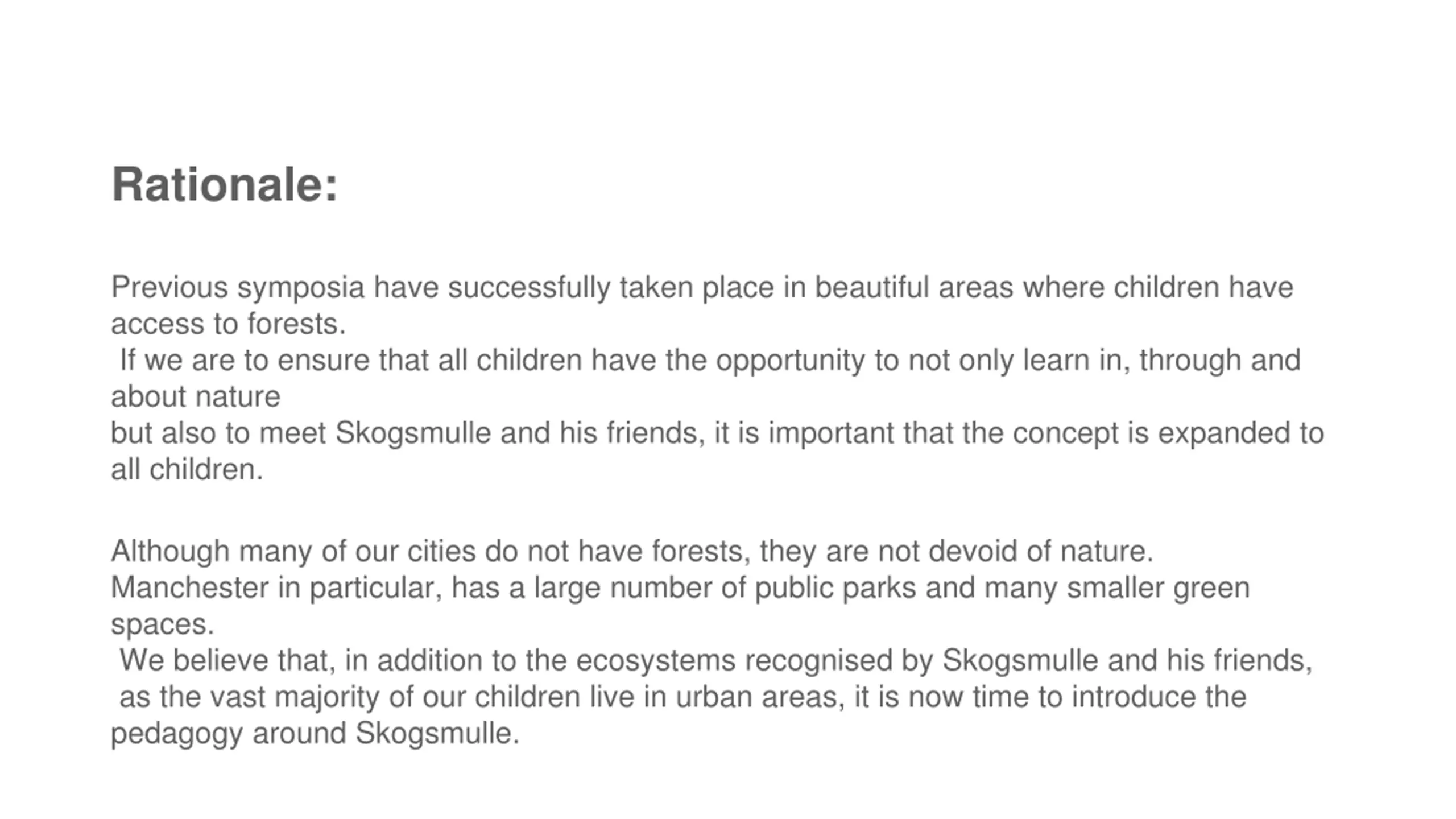 Rationale: Previous symposia have successfully taken place in beautiful areas where children have access to forests. If we are to ensure that all children have the opportunity to not only learn in, through and about nature but also to meet Skogsmulle and his friends, it is important that the concept is expanded to all children. Although many of our cities do not have forests, they are not devoid of nature. Manchester in particular, has a large number of public parks and many smaller green spaces. We believe that, in addition to the ecosystems recognised by Skogsmulle and his friends, as the vast majority of our children live in urban areas, it is now time to introduce the pedagogy around Skogsmulle.