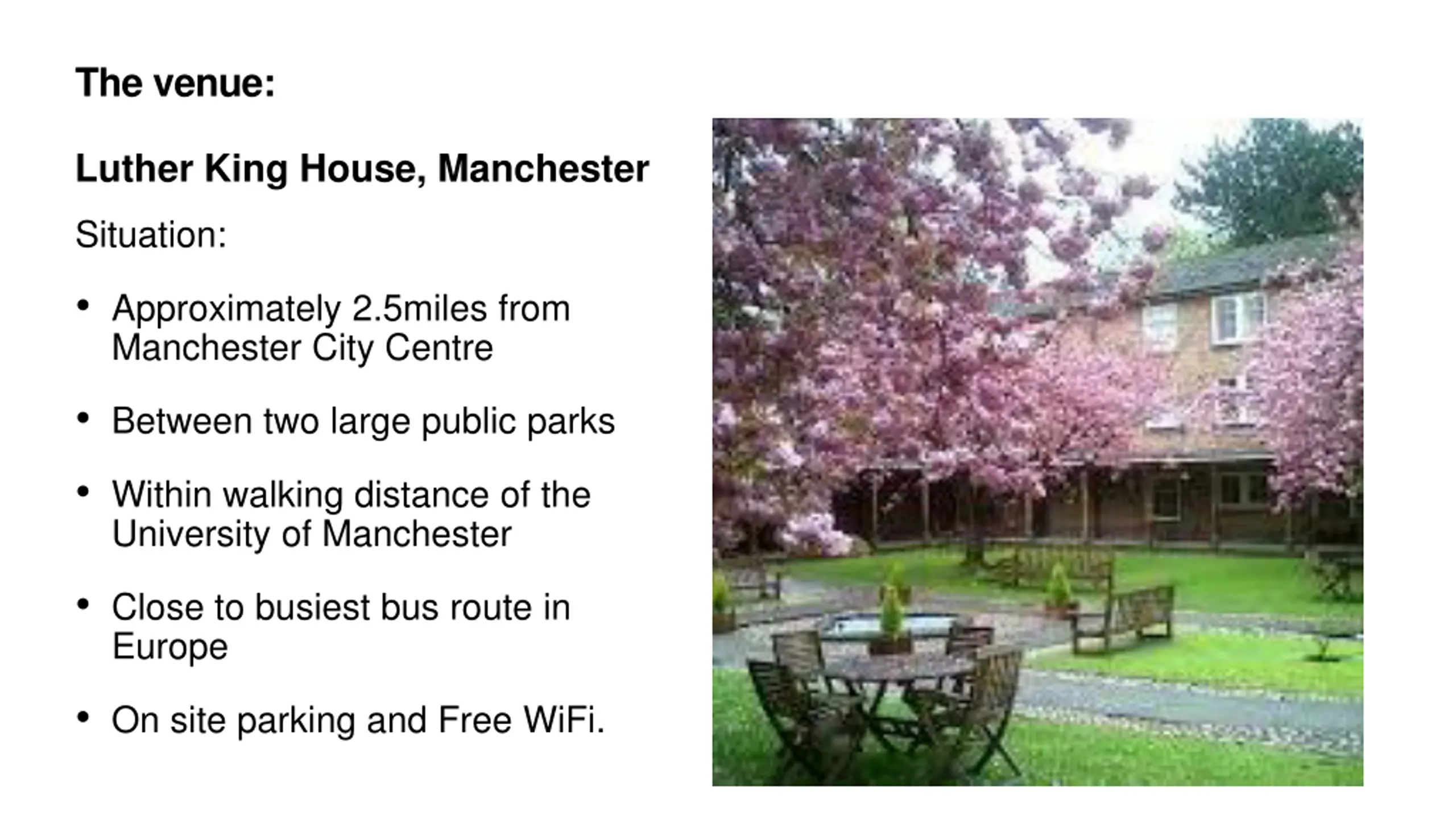 The venue: Luther King House, Manchester Situation: Approximately 2.5miles from Manchester City Centre Between two large public parks Within walking distance of the University of Manchester Close to busiest bus route in Europe On site parking and Free WiFi.
