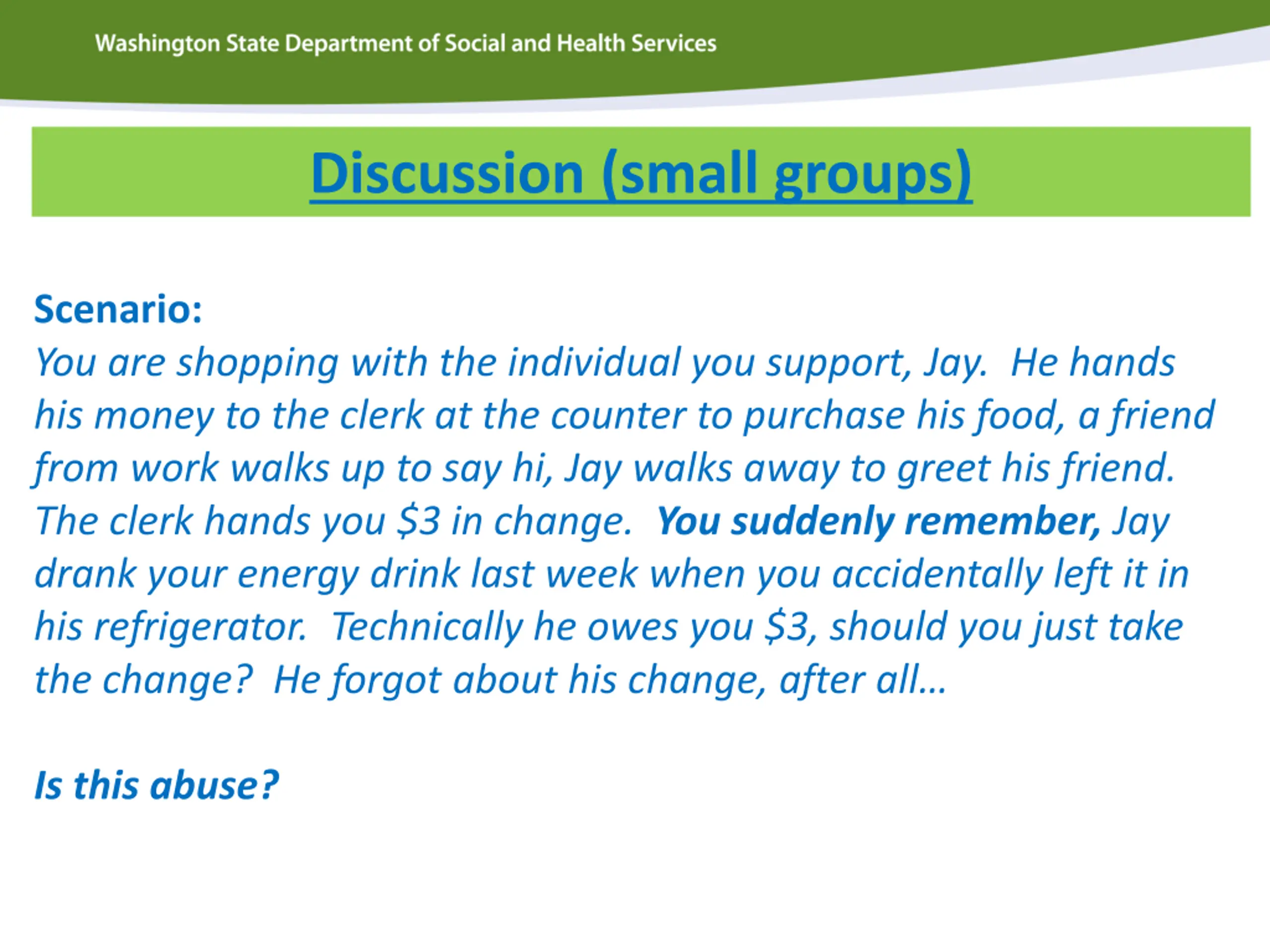 Discussion (small groups) Scenario: You are shopping with the individual you support, Jay. He hands his money to the clerk at the counter to purchase his food, a friend from work walks up to say hi, Jay walks away to greet his friend. The clerk hands you $3 in change. You suddenly remember, Jay drank your energy drink last week when you accidentally left it in his refrigerator. Technically he owes you $3, should you just take the change? He forgot about his change, after all Is this abuse?