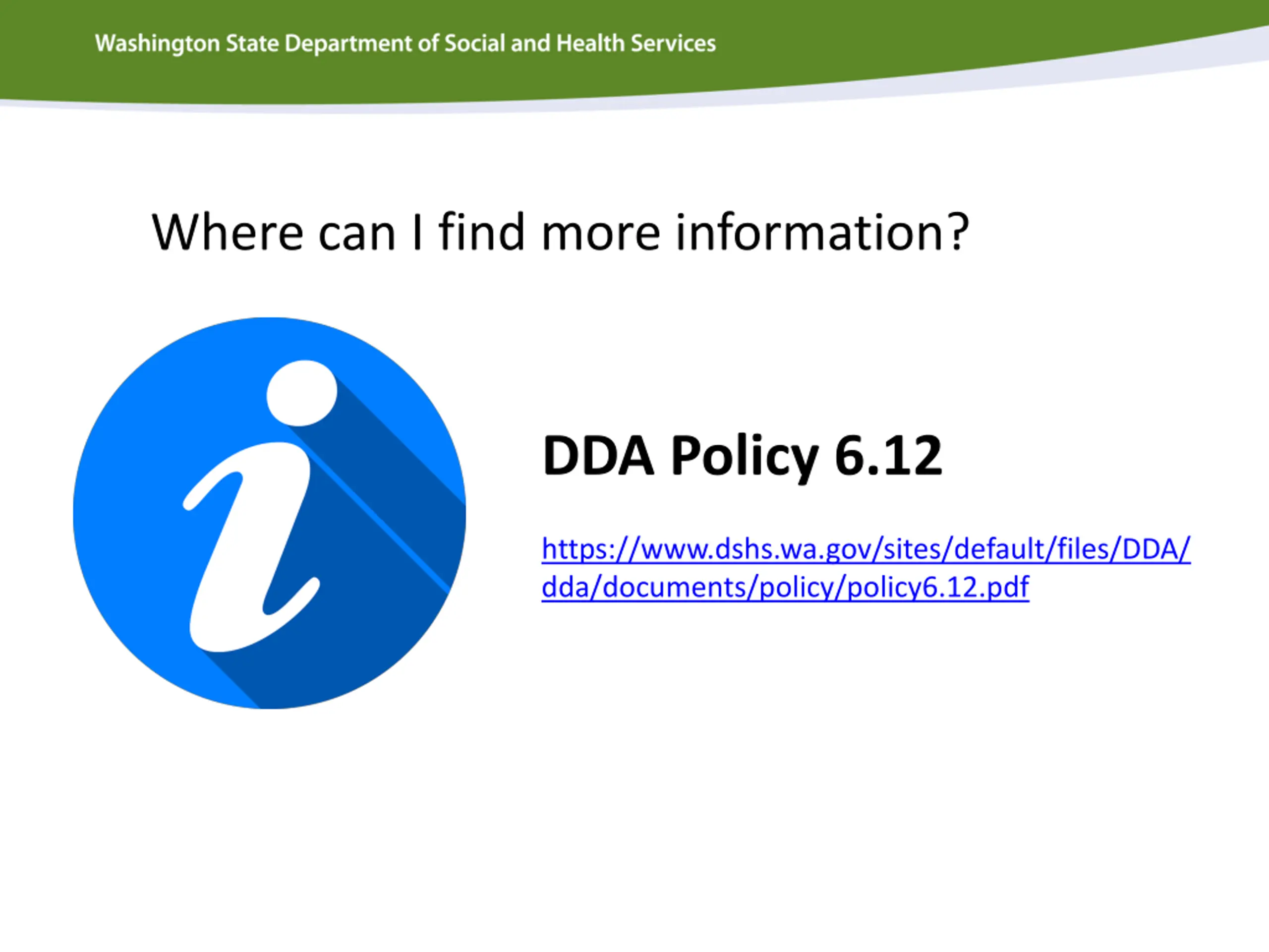 Where can I find more information? DDA Policy 6.12 https://www.dshs.wa.gov/sites/default/files/DDA/ dda/documents/policy/policy6.12.pdf