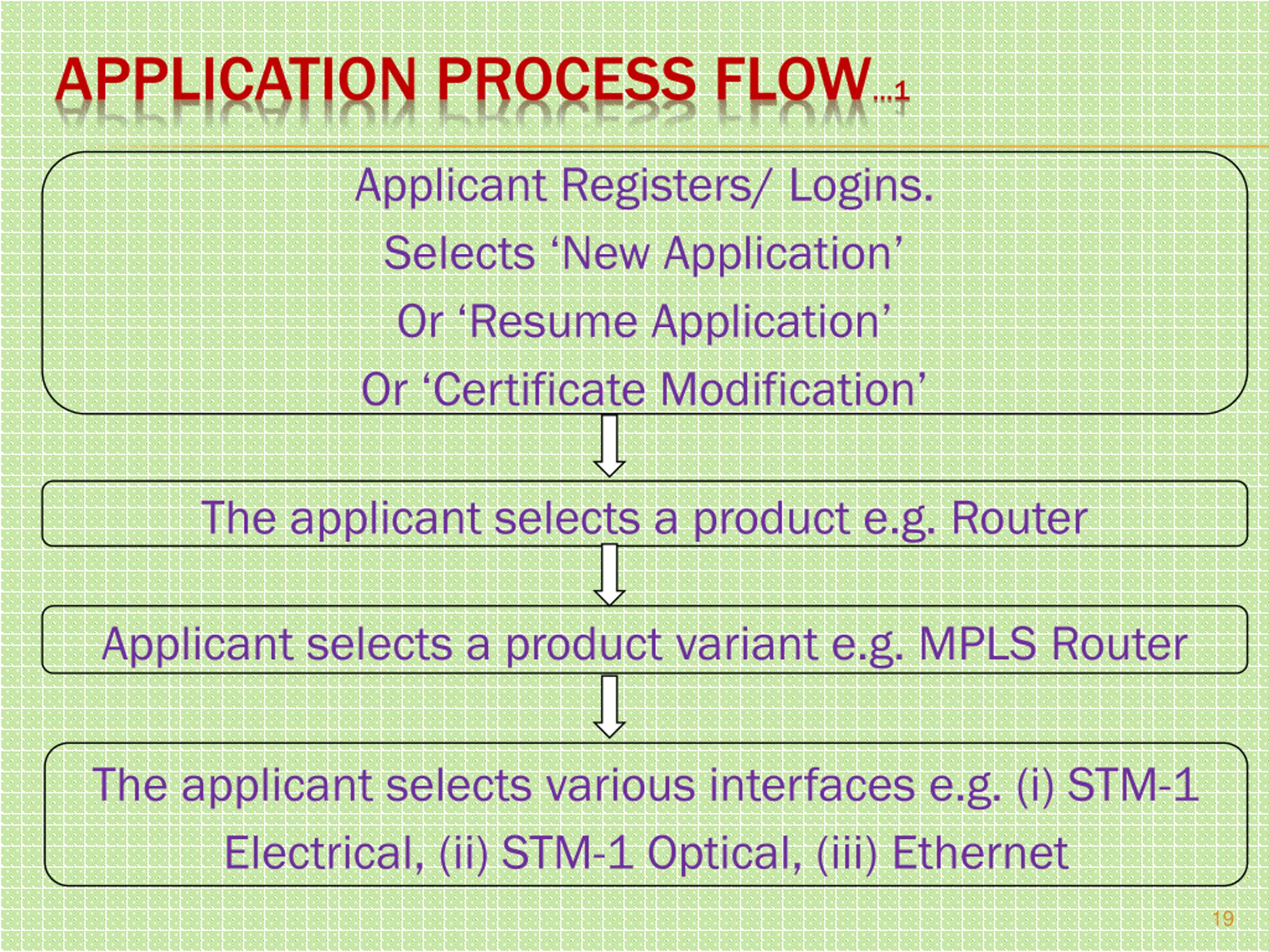 APPLICATION PROCESS FLOW1 Applicant Registers/ Logins. Selects New Application Or Resume Application Or Certificate Modification The applicant selects a product e.g. Router Applicant selects a product variant e.g. MPLS Router The applicant selects various interfaces e.g. (i) STM-1 Electrical, (ii) STM-1 Optical, (iii) Ethernet 19