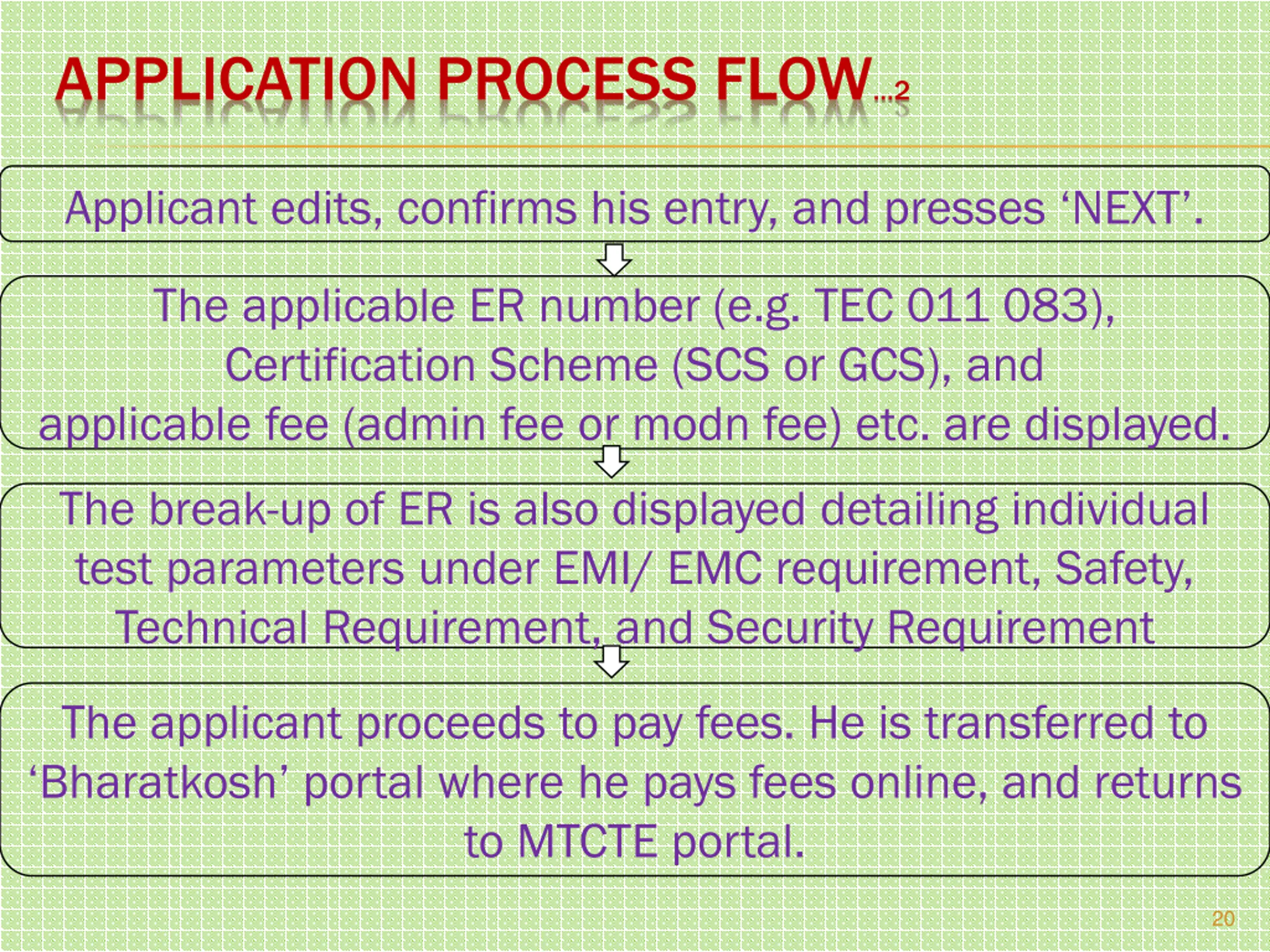 APPLICATION PROCESS FLOW2 Applicant edits, confirms his entry, and presses NEXT . The applicable ER number (e.g. TEC 011 083), Certification Scheme (SCS or GCS), and applicable fee (admin fee or modn fee) etc. are displayed. The break-up of ER is also displayed detailing individual test parameters under EMI/ EMC requirement, Safety, Technical Requirement, and Security Requirement The applicant proceeds to pay fees. He is transferred to Bharatkosh portal where he pays fees online, and returns to MTCTE portal. 20