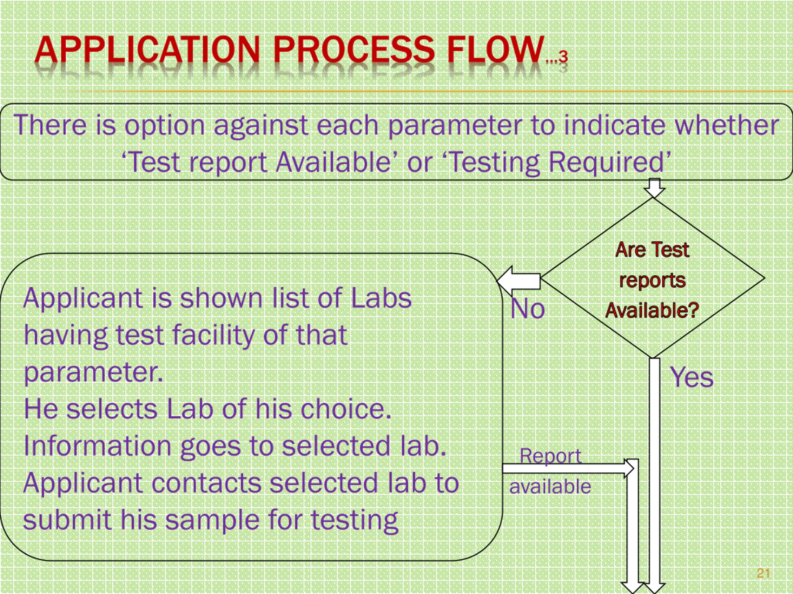 APPLICATION PROCESS FLOW3 There is option against each parameter to indicate whether Test report Available or Testing Required Are Test reports Available? Applicant is shown list of Labs having test facility of that parameter. He selects Lab of his choice. Information goes to selected lab. Applicant contacts selected lab to submit his sample for testing No Yes Report available 21