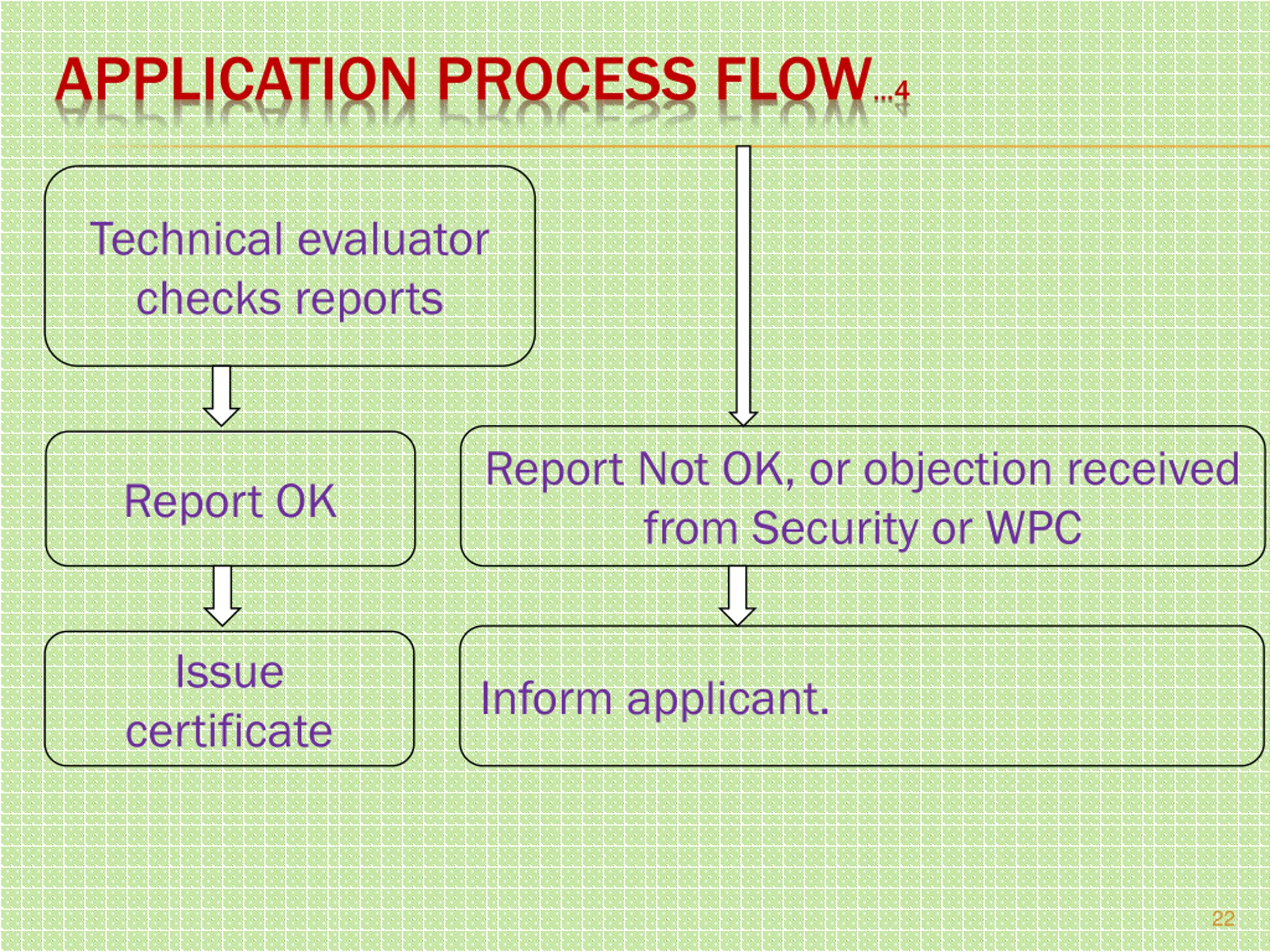 APPLICATION PROCESS FLOW4 Technical evaluator checks reports Report Not OK, or objection received from Security or WPC Report OK Issue certificate Inform applicant. 22