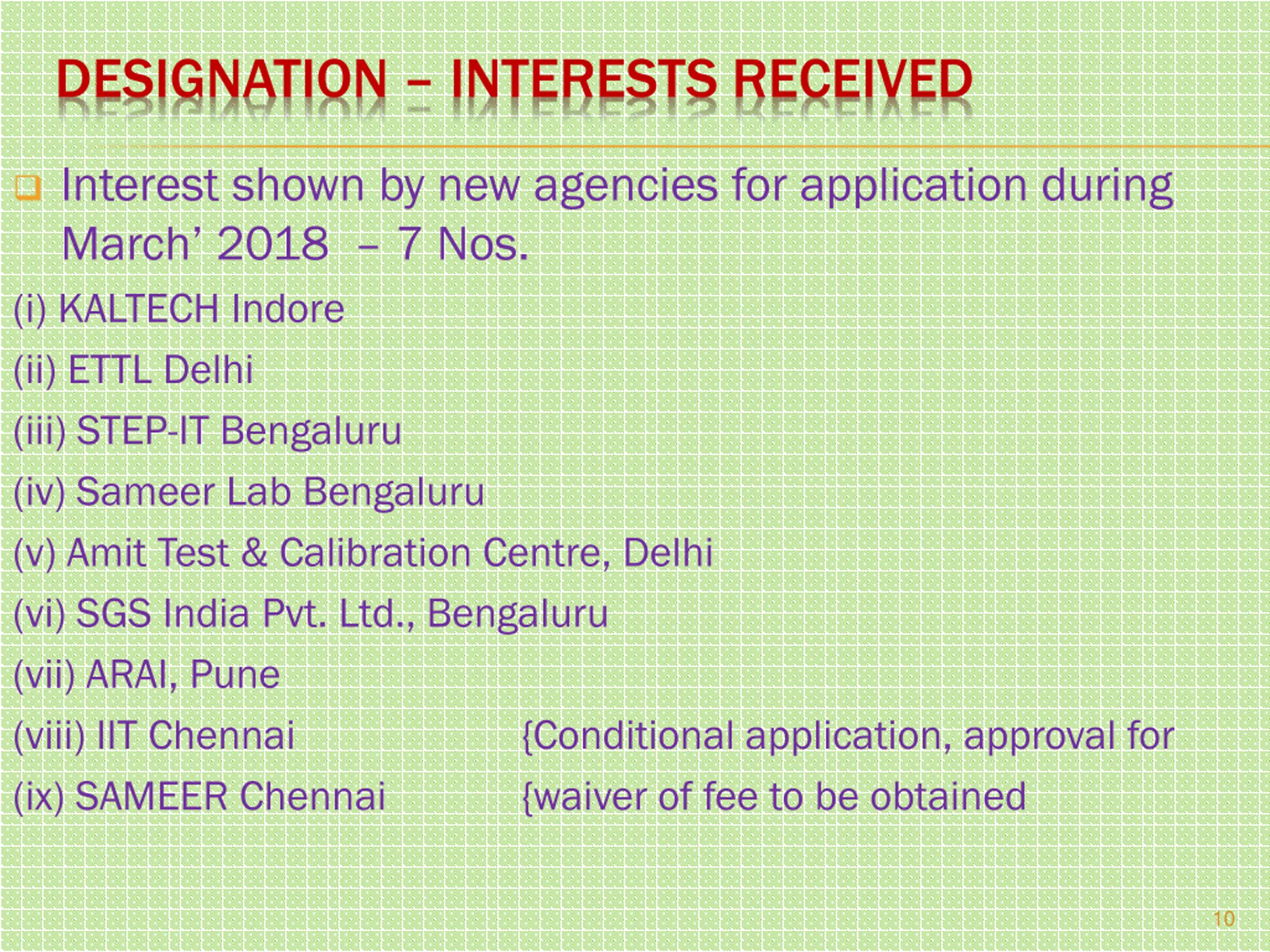 DESIGNATION INTERESTS RECEIVED Interest shown by new agencies for application during March 2018 7 Nos. (i) KALTECH Indore (ii) ETTL Delhi (iii) STEP-IT Bengaluru (iv) Sameer Lab Bengaluru (v) Amit Test & Calibration Centre, Delhi (vi) SGS India Pvt. Ltd., Bengaluru (vii) ARAI, Pune (viii) IIT Chennai {Conditional application, approval for (ix) SAMEER Chennai {waiver of fee to be obtained 10