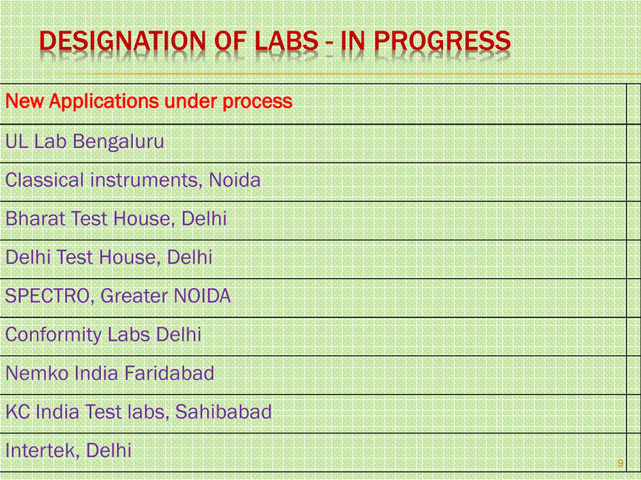 DESIGNATION OF LABS - IN PROGRESS New Applications under process New Applications under process UL Lab Bengaluru Classical instruments, Noida Bharat Test House, Delhi Delhi Test House, Delhi SPECTRO, Greater NOIDA Conformity Labs Delhi Nemko India Faridabad KC India Test labs, Sahibabad Intertek, Delhi 9