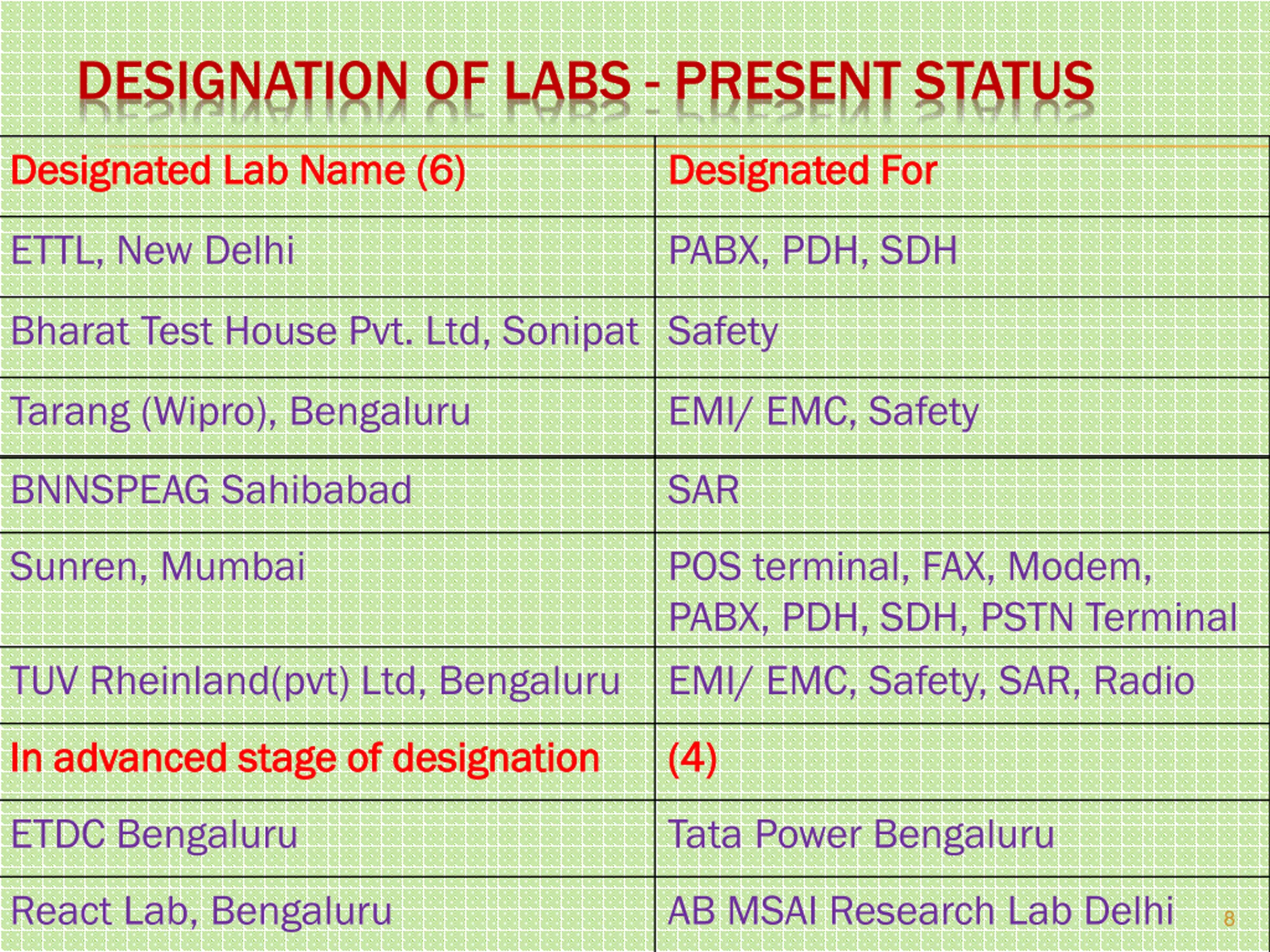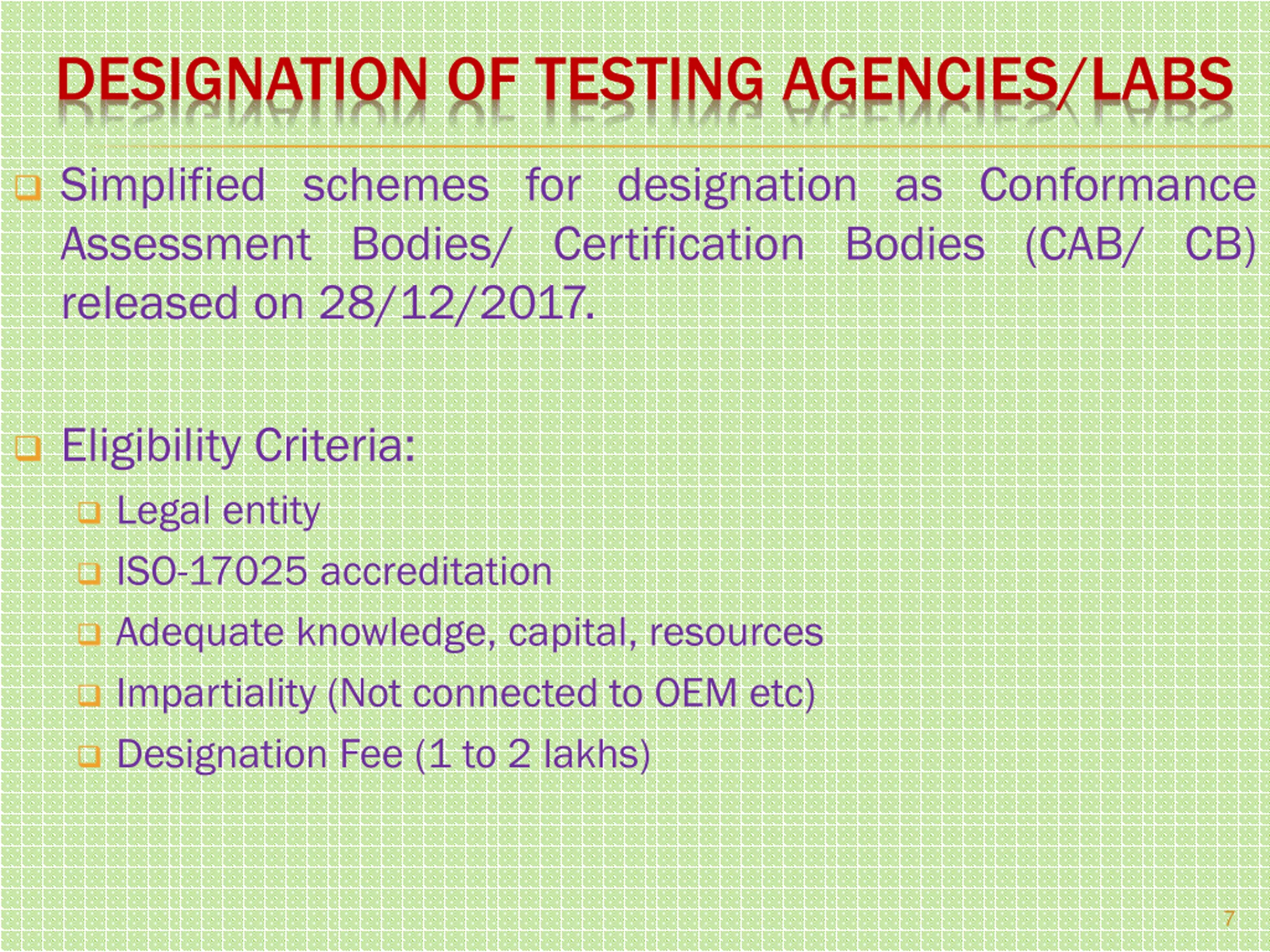 DESIGNATION OF TESTING AGENCIES/LABS Simplified schemes for designation as Conformance Assessment Bodies/ Certification Bodies (CAB/ CB) released on 28/12/2017. Eligibility Criteria: Legal entity ISO-17025 accreditation Adequate knowledge, capital, resources Impartiality (Not connected to OEM etc) Designation Fee (1 to 2 lakhs) 7