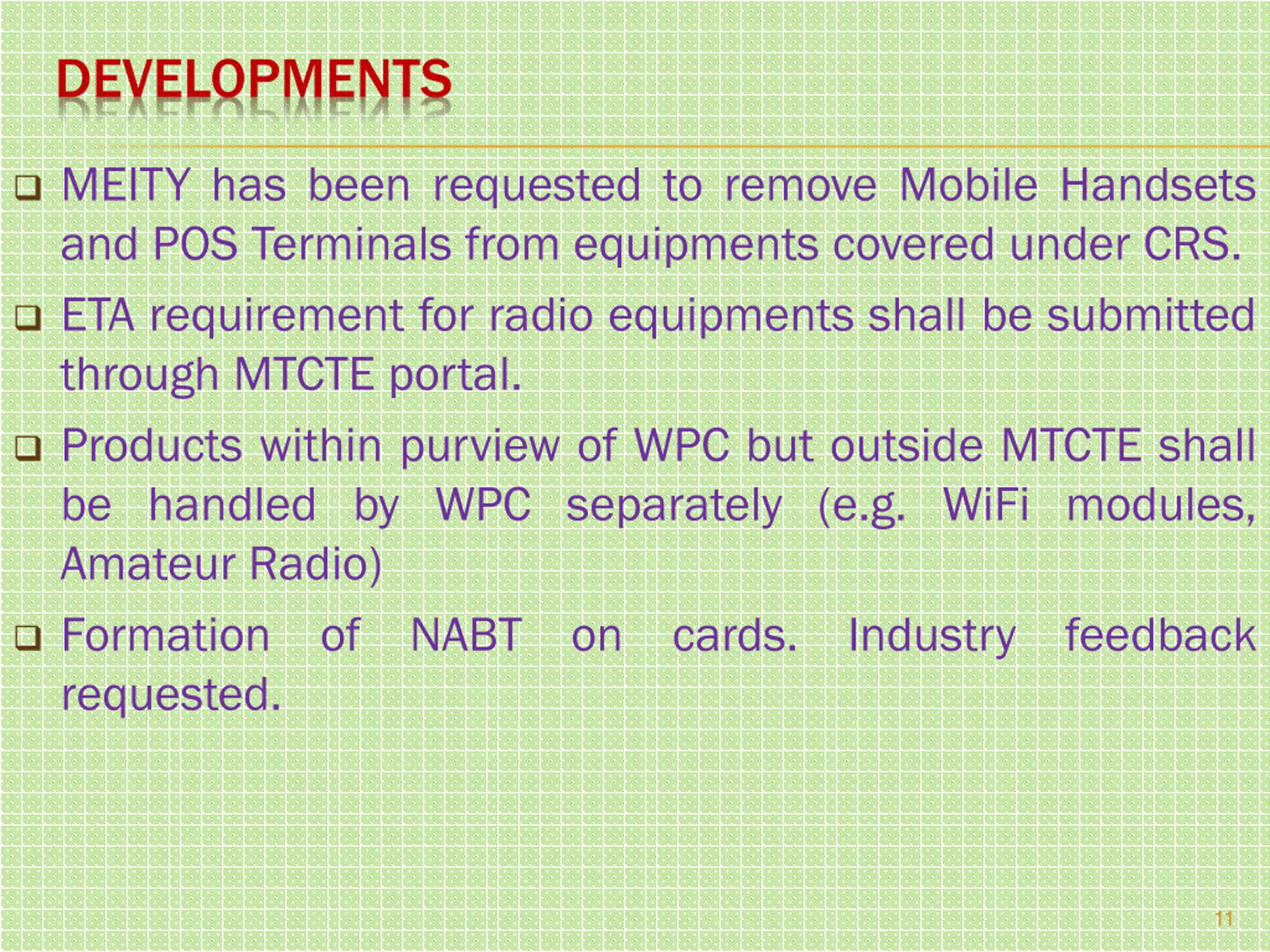 DEVELOPMENTS MEITY has been requested to remove Mobile Handsets and POS Terminals from equipments covered under CRS. ETA requirement for radio equipments shall be submitted through MTCTE portal. Products within purview of WPC but outside MTCTE shall be handled by WPC separately (e.g. WiFi modules, Amateur Radio) Formation of NABT on cards. Industry feedback requested. 11