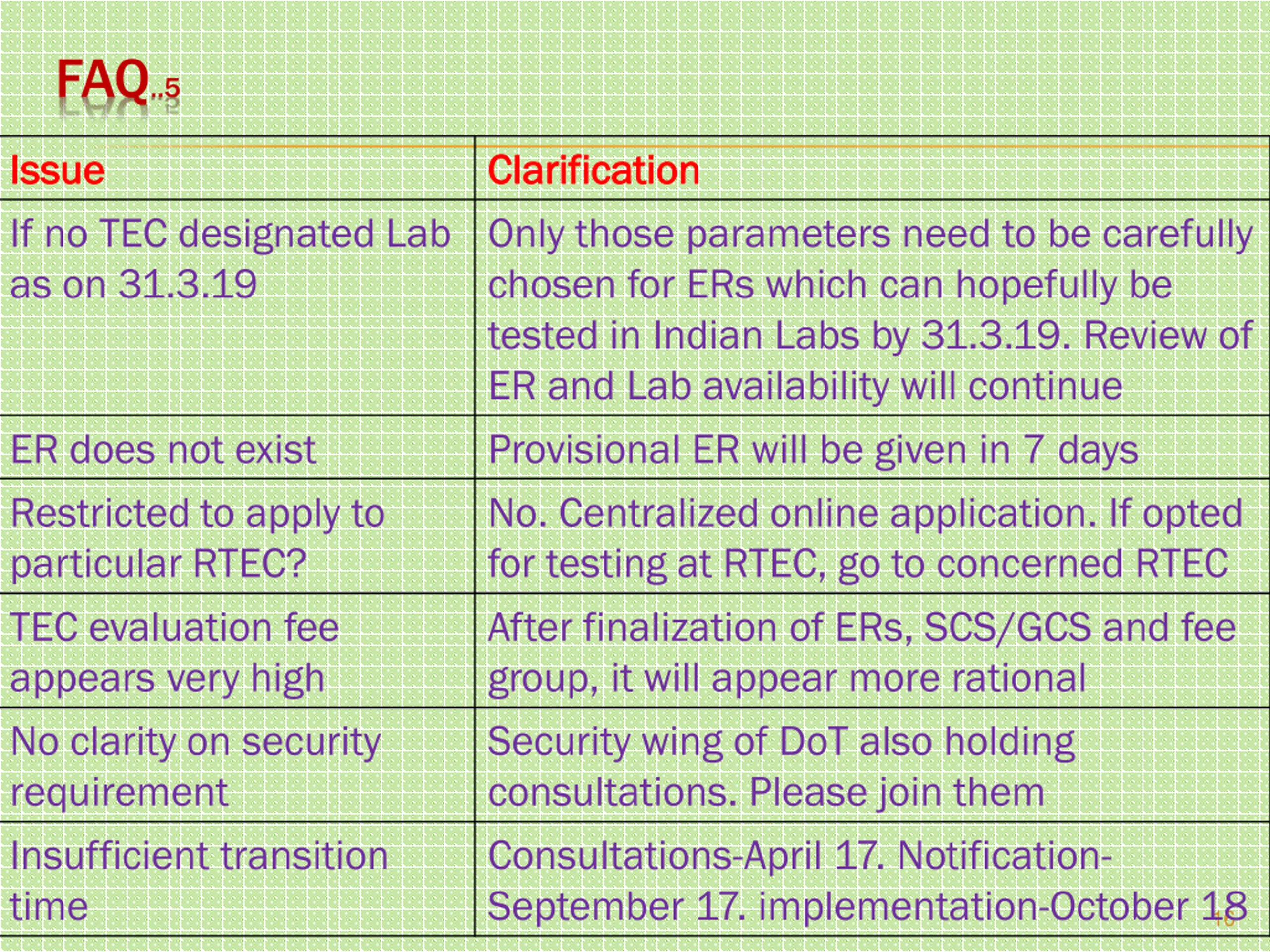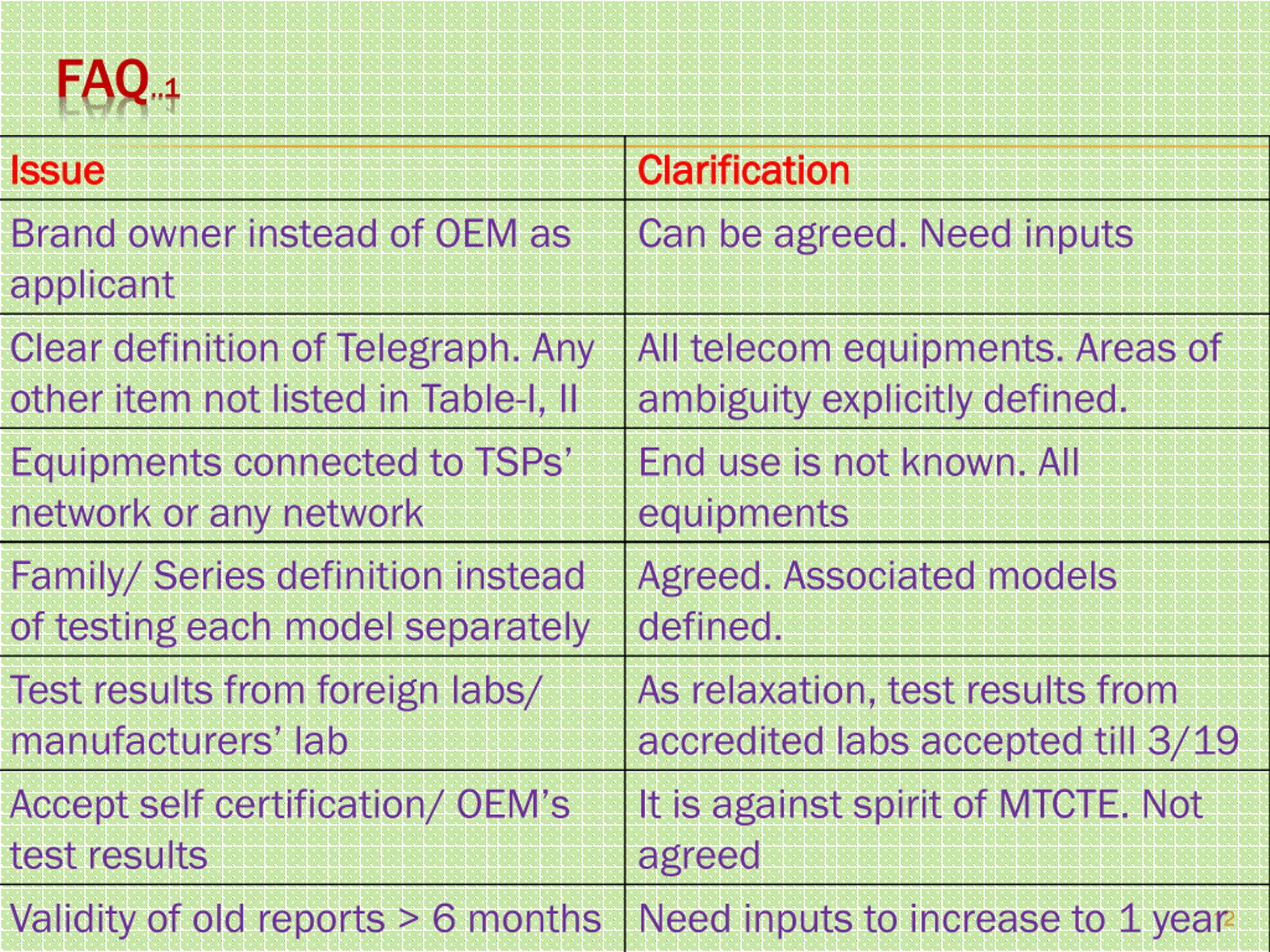 FAQ..1 Issue Issue Brand owner instead of OEM as applicant Clear definition of Telegraph. Any other item not listed in Table-I, II Equipments connected to TSPs network or any network Family/ Series definition instead of testing each model separately Test results from foreign labs/ manufacturers lab Accept self certification/ OEM s test results Validity of old reports > 6 months Need inputs to increase to 1 year Clarification Clarification Can be agreed. Need inputs All telecom equipments. Areas of ambiguity explicitly defined. End use is not known. All equipments Agreed. Associated models defined. As relaxation, test results from accredited labs accepted till 3/19 It is against spirit of MTCTE. Not agreed 12