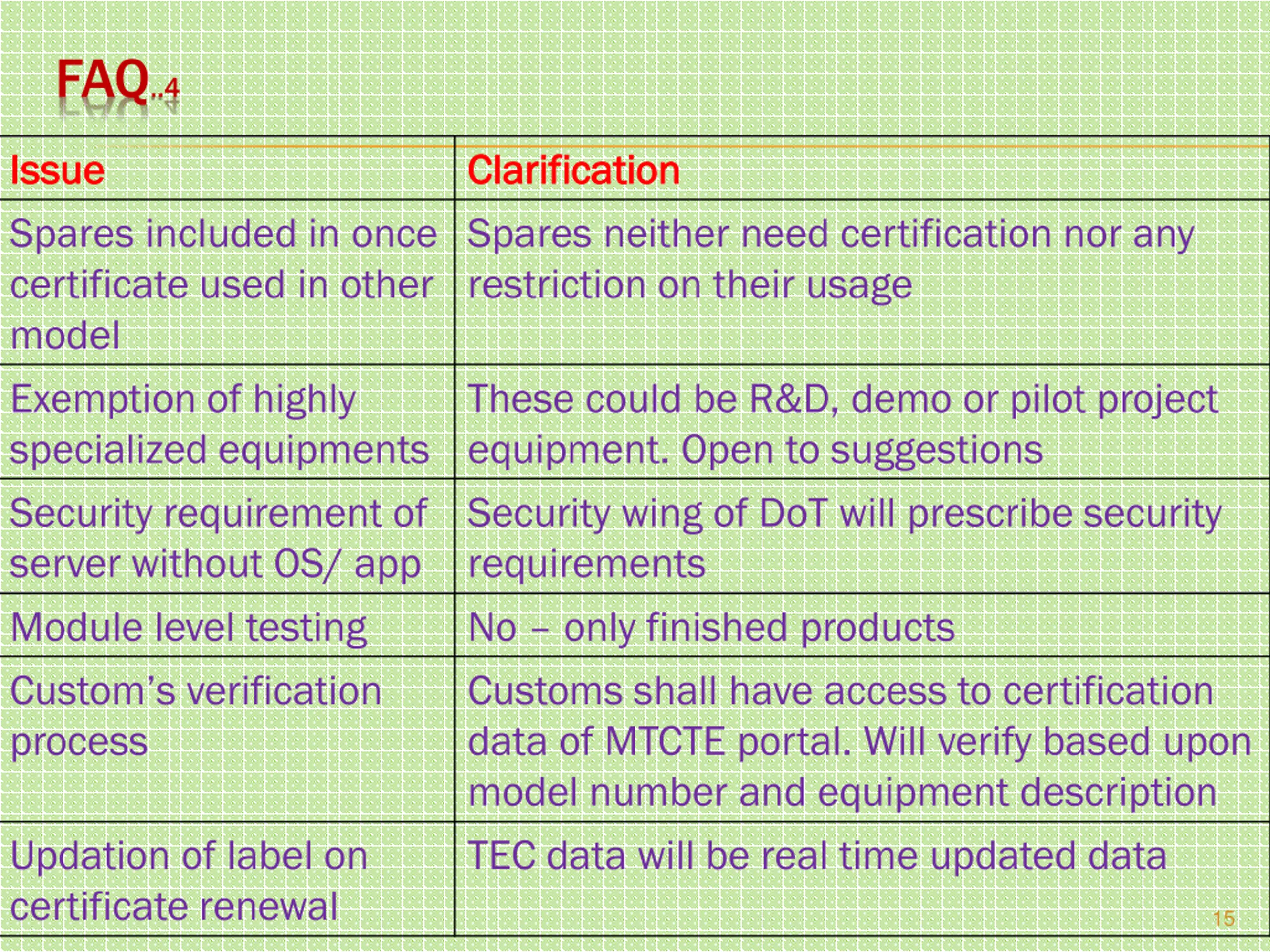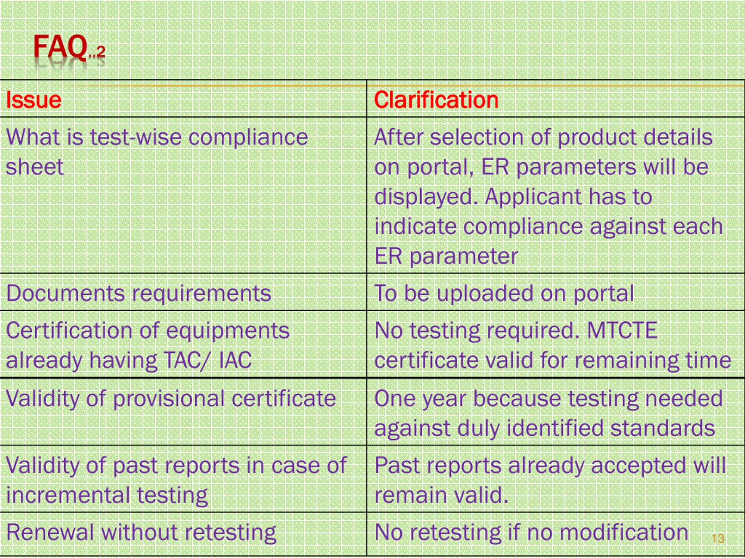 FAQ..2 Issue Issue What is test-wise compliance sheet Clarification Clarification After selection of product details on portal, ER parameters will be displayed. Applicant has to indicate compliance against each ER parameter To be uploaded on portal No testing required. MTCTE certificate valid for remaining time One year because testing needed against duly identified standards Past reports already accepted will remain valid. No retesting if no modification Documents requirements Certification of equipments already having TAC/ IAC Validity of provisional certificate Validity of past reports in case of incremental testing Renewal without retesting 13