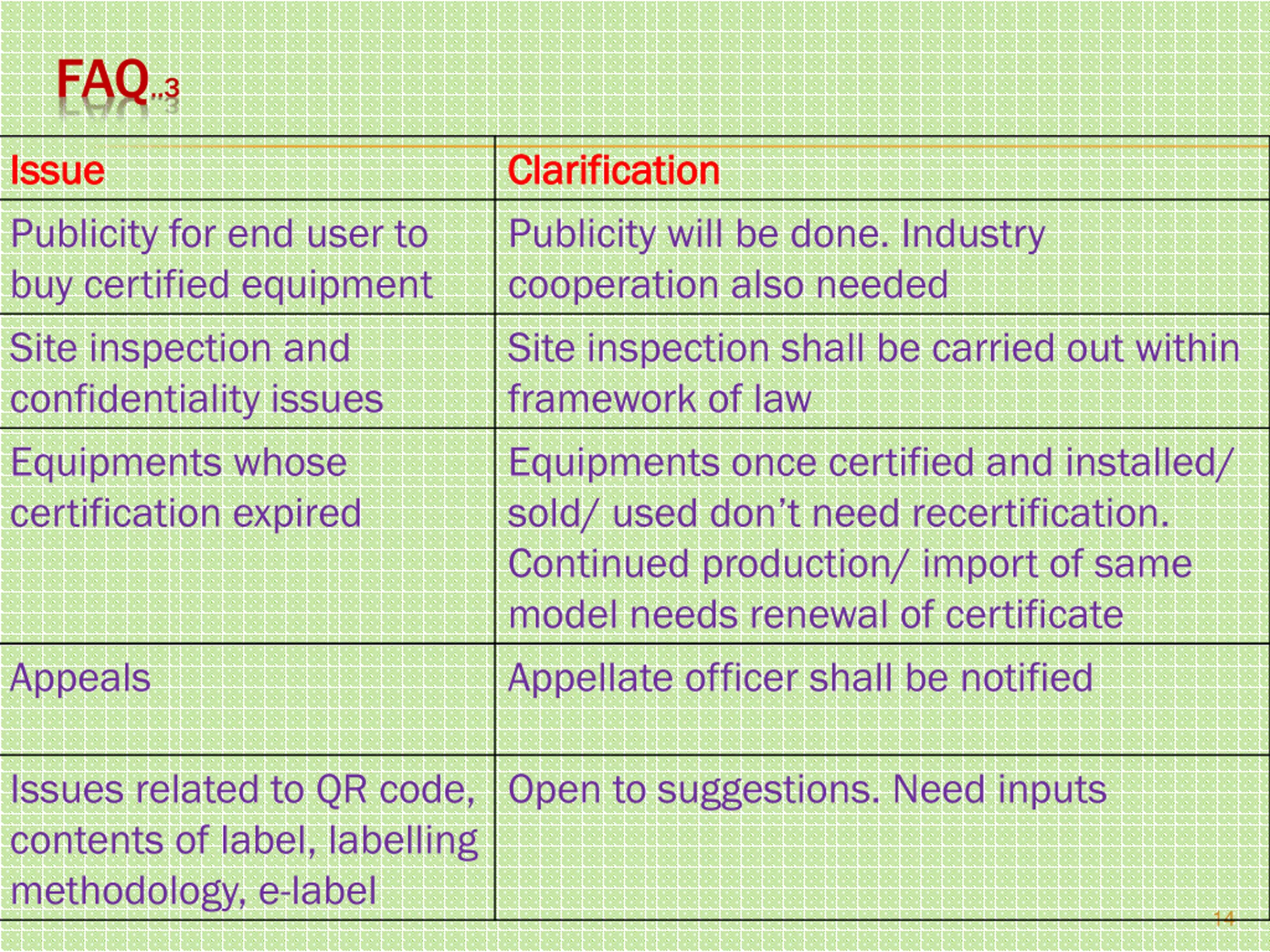 FAQ..3 Issue Issue Publicity for end user to buy certified equipment Site inspection and confidentiality issues Equipments whose certification expired Clarification Clarification Publicity will be done. Industry cooperation also needed Site inspection shall be carried out within framework of law Equipments once certified and installed/ sold/ used don t need recertification. Continued production/ import of same model needs renewal of certificate Appellate officer shall be notified Appeals Issues related to QR code, contents of label, labelling methodology, e-label Open to suggestions. Need inputs 14