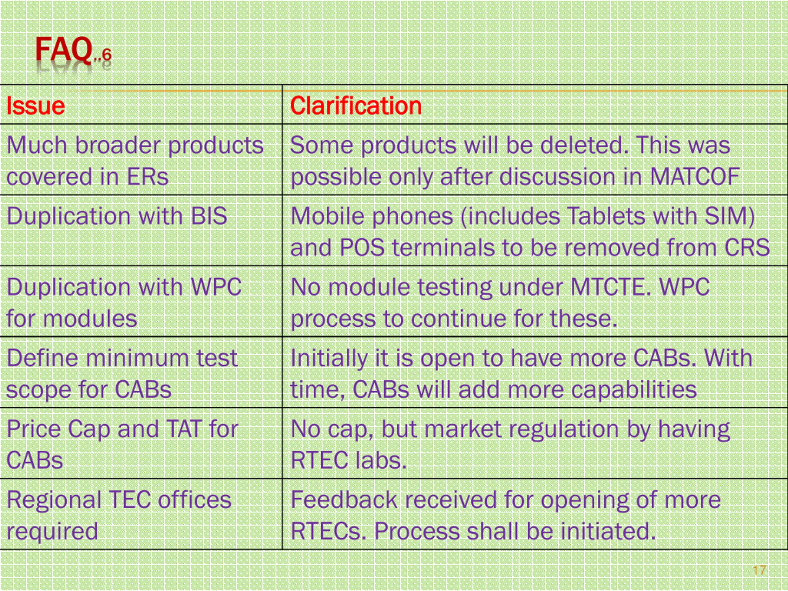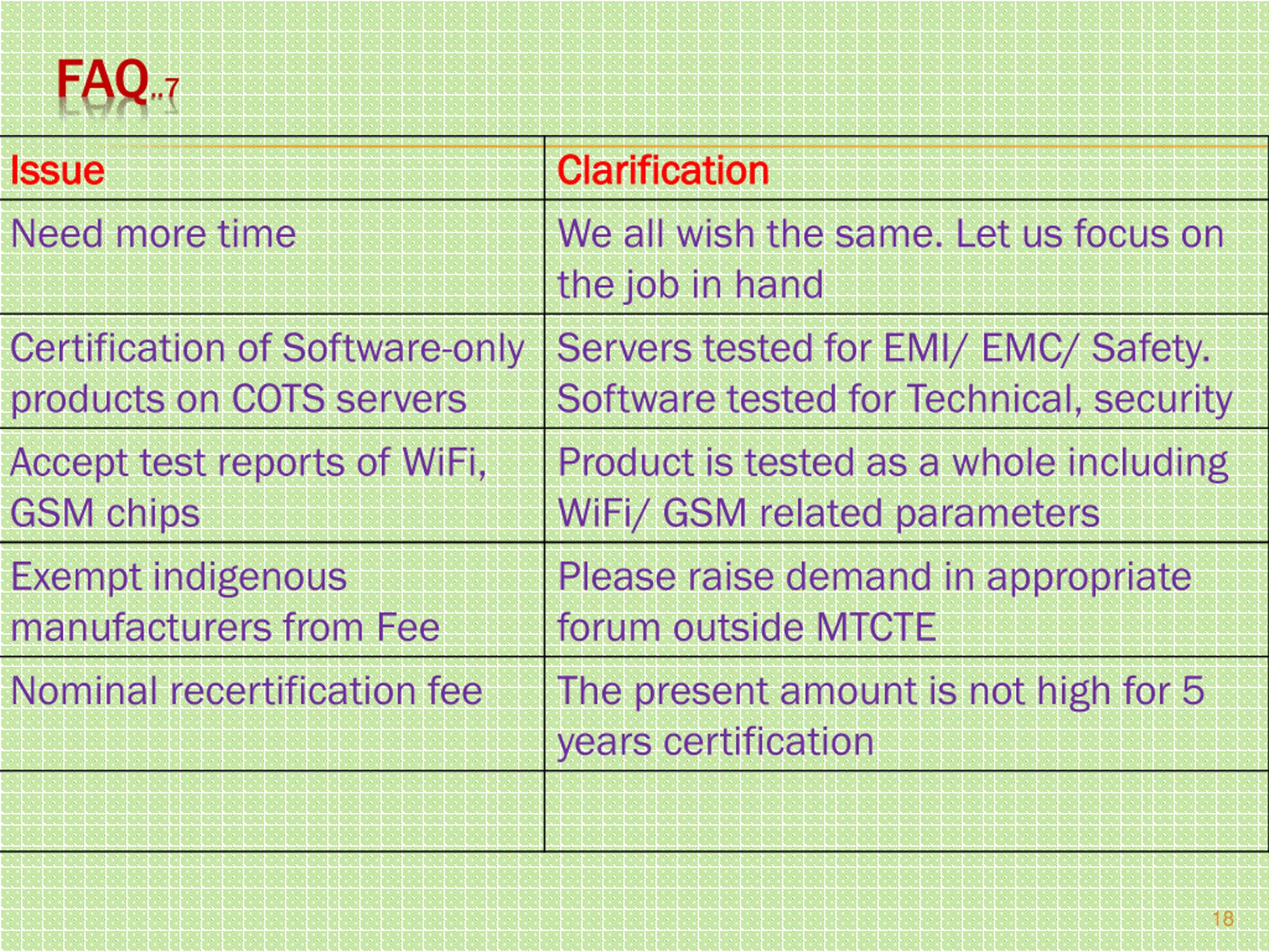 FAQ..6 Issue Issue Much broader products covered in ERs Duplication with BIS Clarification Clarification Some products will be deleted. This was possible only after discussion in MATCOF Mobile phones (includes Tablets with SIM) and POS terminals to be removed from CRS No module testing under MTCTE. WPC process to continue for these. Initially it is open to have more CABs. With time, CABs will add more capabilities No cap, but market regulation by having RTEC labs. Feedback received for opening of more RTECs. Process shall be initiated. Duplication with WPC for modules Define minimum test scope for CABs Price Cap and TAT for CABs Regional TEC offices required 17