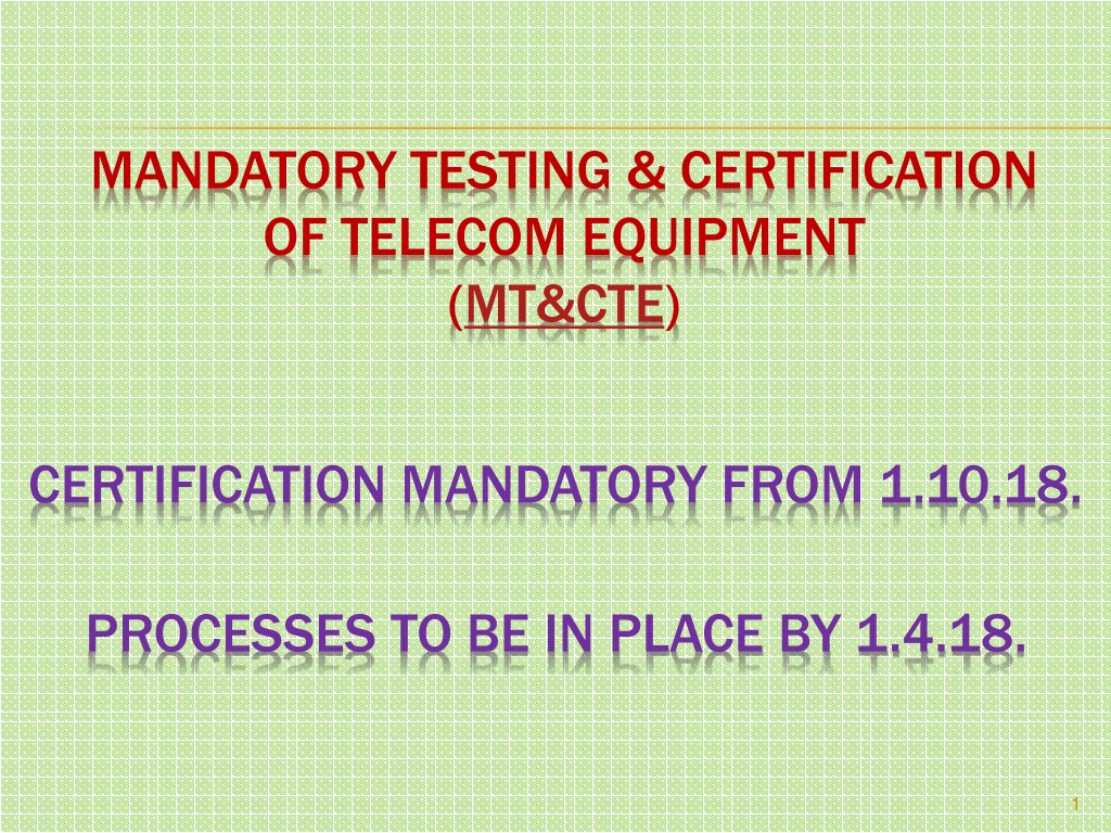 MANDATORY TESTING & CERTIFICATION OF TELECOM EQUIPMENT (MT&CTE) CERTIFICATION MANDATORY FROM 1.10.18. PROCESSES TO BE IN PLACE BY 1.4.18. 1