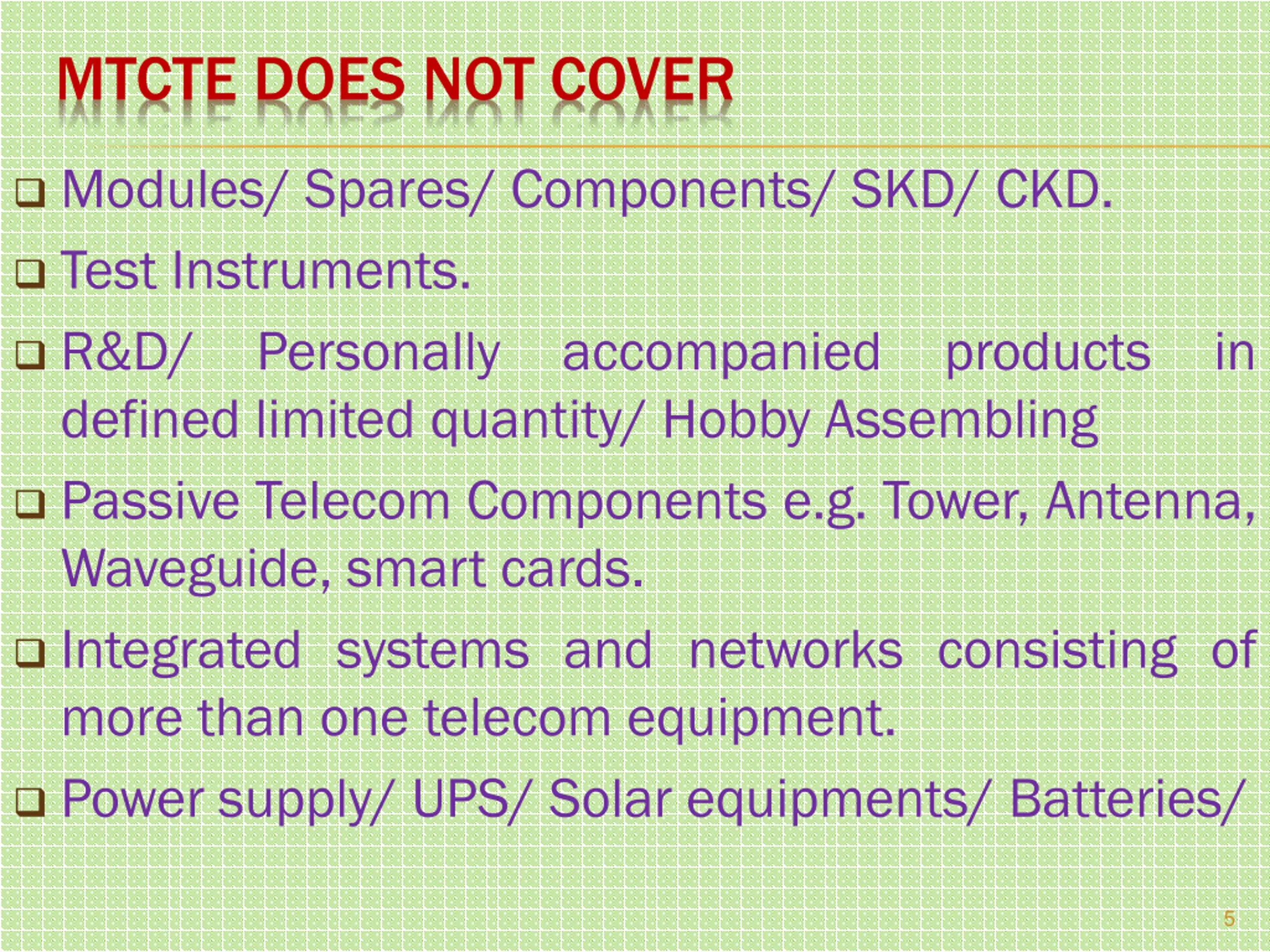 MTCTE DOES NOT COVER Modules/ Spares/ Components/ SKD/ CKD. Test Instruments. R&D/ Personally accompanied products in defined limited quantity/ Hobby Assembling Passive Telecom Components e.g. Tower, Antenna, Waveguide, smart cards. Integrated systems and networks consisting of more than one telecom equipment. Power supply/ UPS/ Solar equipments/ Batteries/ 5