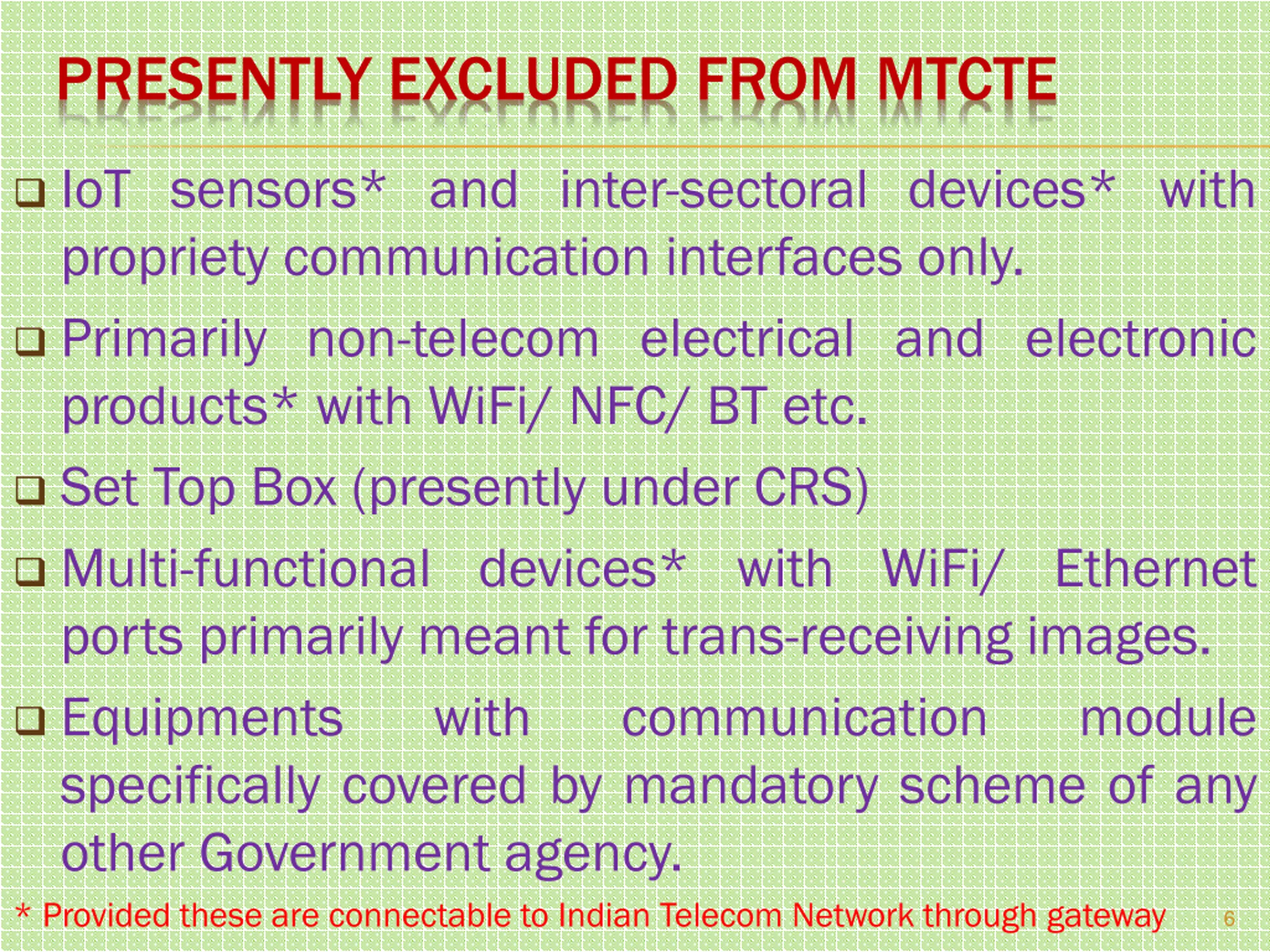 PRESENTLY EXCLUDED FROM MTCTE IoT sensors* and inter-sectoral devices* with propriety communication interfaces only. Primarily non-telecom electrical and electronic products* with WiFi/ NFC/ BT etc. Set Top Box (presently under CRS) Multi-functional devices* with WiFi/ Ethernet ports primarily meant for trans-receiving images. Equipments with communication specifically covered by mandatory scheme of any other Government agency. * Provided these are connectable to Indian Telecom Network through gateway module 6