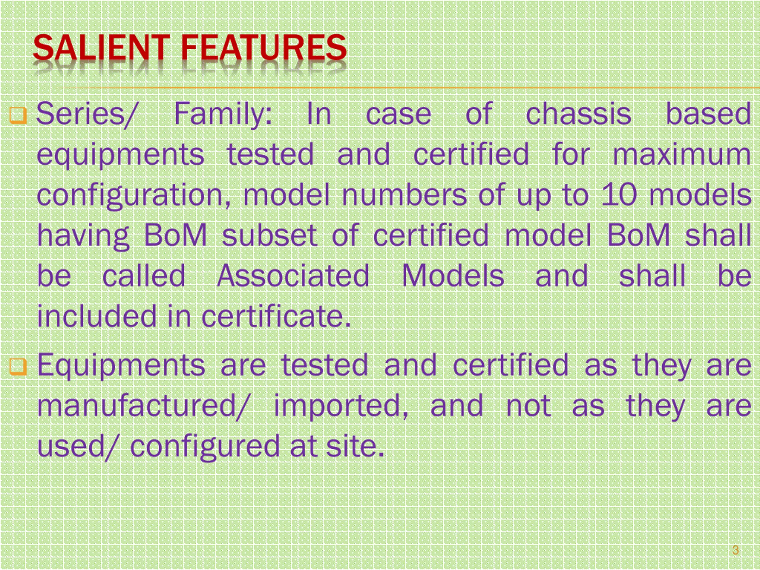 SALIENT FEATURES Series/ Family: In case of chassis based equipments tested and certified for maximum configuration, model numbers of up to 10 models having BoM subset of certified model BoM shall be called Associated Models and shall be included in certificate. Equipments are tested and certified as they are manufactured/ imported, and not as they are used/ configured at site. 3