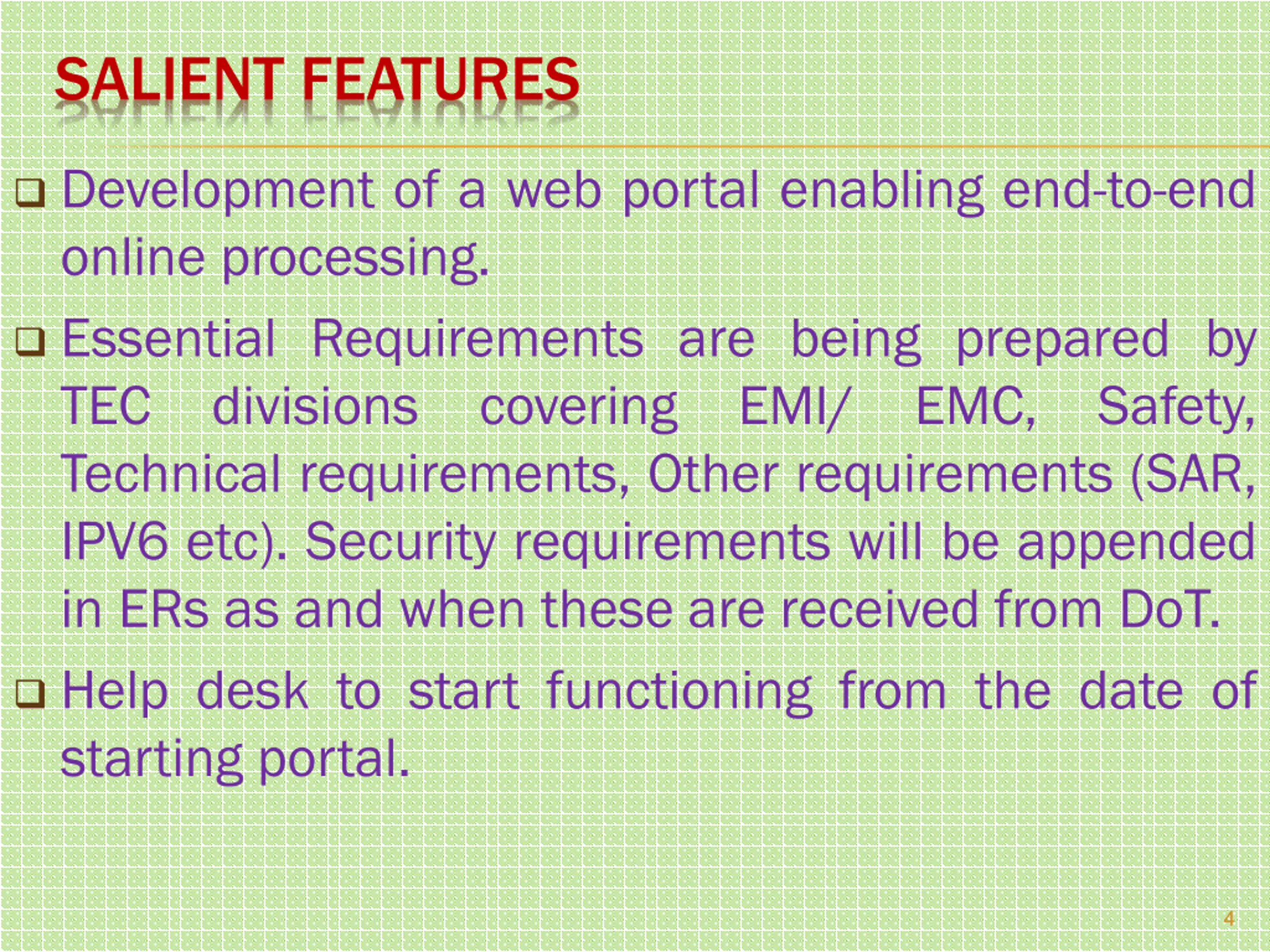 SALIENT FEATURES Development of a web portal enabling end-to-end online processing. Essential Requirements are being prepared by TEC divisions covering EMI/ EMC, Safety, Technical requirements, Other requirements (SAR, IPV6 etc). Security requirements will be appended in ERs as and when these are received from DoT. Help desk to start functioning from the date of starting portal. 4