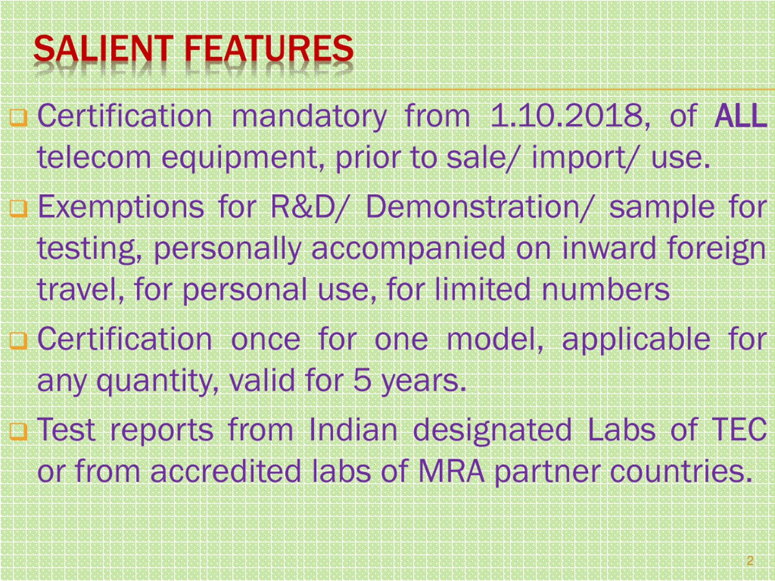 SALIENT FEATURES Certification mandatory from 1.10.2018, of ALL telecom equipment, prior to sale/ import/ use. Exemptions for R&D/ Demonstration/ sample for testing, personally accompanied on inward foreign travel, for personal use, for limited numbers Certification once for one model, applicable for any quantity, valid for 5 years. Test reports from Indian designated Labs of TEC or from accredited labs of MRA partner countries. ALL 2