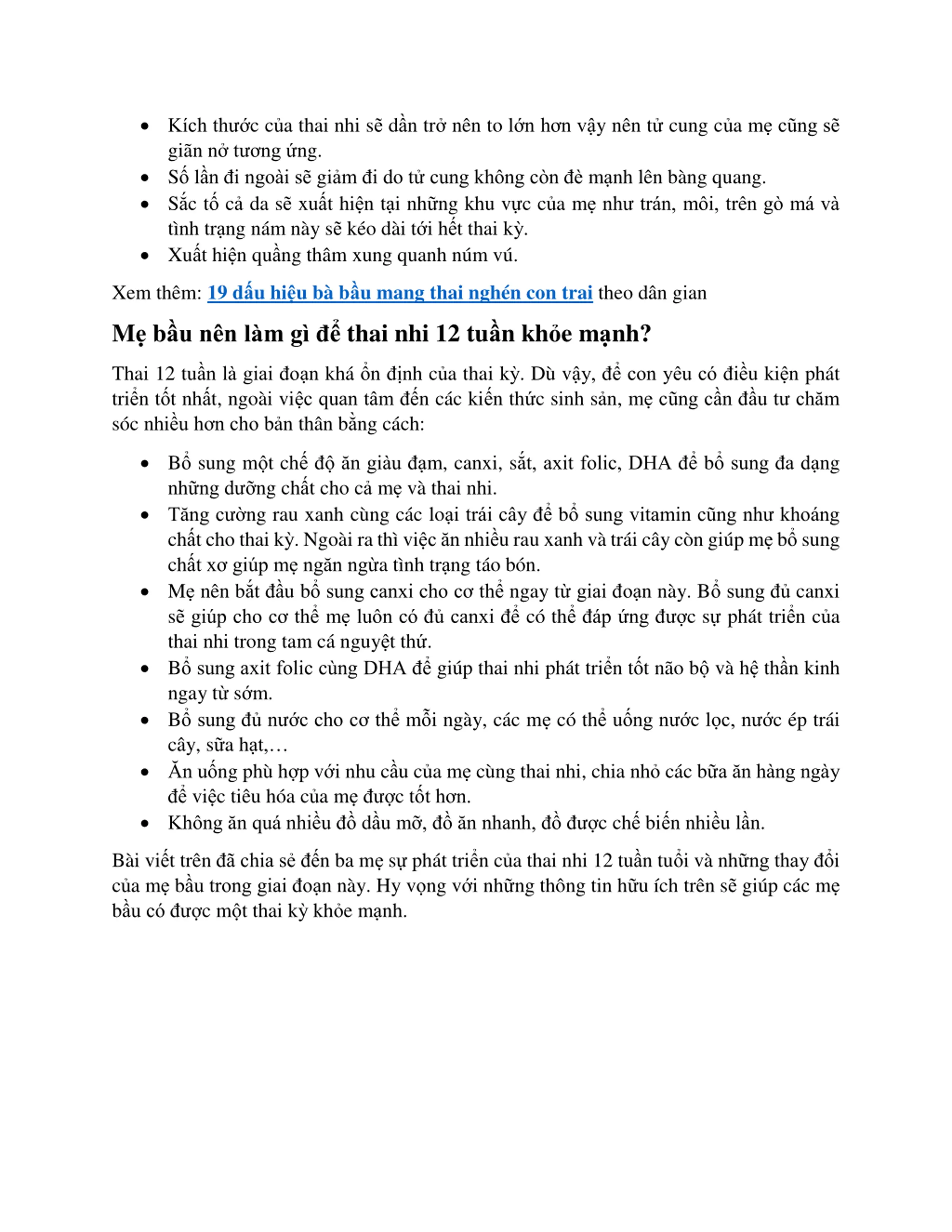 Kch thc ca thai nhi s dn tr nn to ln hn vy nn t cung ca mcng s gi n n t ng ng. S l n i ngo i s gi m i do t cung kh ng c n m nh l n b ng quang. S c t c da s xu t hi n t i nh ng khu v c c a m nh tr n, m i, tr n g m v t nh tr ng n m n y s k o d i t i h t thai k . Xu t hi n qu ng th m xung quanh n m v . Xem th m: 19 d u hi u b b u mang thai ngh n con trai theo d n gian M b u n n l m g thai nhi 12 tu n kh e m nh? Thai 12 tu n l giai o n kh n nh c a thai k . D v y, con y u c i u ki n ph t tri n t t nh t, ngo i vi c quan t m n c c ki n th c sinh s n, m c ng c n u t ch m s c nhi u h n cho b n th n b ng c ch: B sung m t ch n gi u m, canxi, s t, axit folic, DHA b sung a d ng nh ng d ng ch t cho c m v thai nhi. T ng c ng rau xanh c ng c c lo i tr i c y b sung vitamin c ng nh kho ng ch t cho thai k . Ngo i ra th vi c n nhi u rau xanh v tr i c y c n gi p m b sung ch t x gi p m ng n ng a t nh tr ng t o b n. M n n b t u b sung canxi cho c th ngay t giai o n n y. B sung canxi s gi p cho c th m lu n c canxi c th p ng c s ph t tri n c a thai nhi trong tam c nguy t th . B sung axit folic c ng DHA gi p thai nhi ph t tri n t t n o b v h th n kinh ngay t s m. B sung n c cho c th m i ng y, c c m c th u ng n c l c, n c p tr i c y, s a h t, n u ng ph h p v i nhu c u c a m c ng thai nhi, chia nh c c b a n h ng ng y vi c ti u h a c a m c t t h n. Kh ng n qu nhi u d u m , n nhanh, c ch bi n nhi u l n. B i vi t tr n chia s n ba m s ph t tri n c a thai nhi 12 tu n tu i v nh ng thay i c a m b u trong giai o n n y. Hy v ng v i nh ng th ng tin h u ch tr n s gi p c c m b u c c m t thai k kh e m nh.