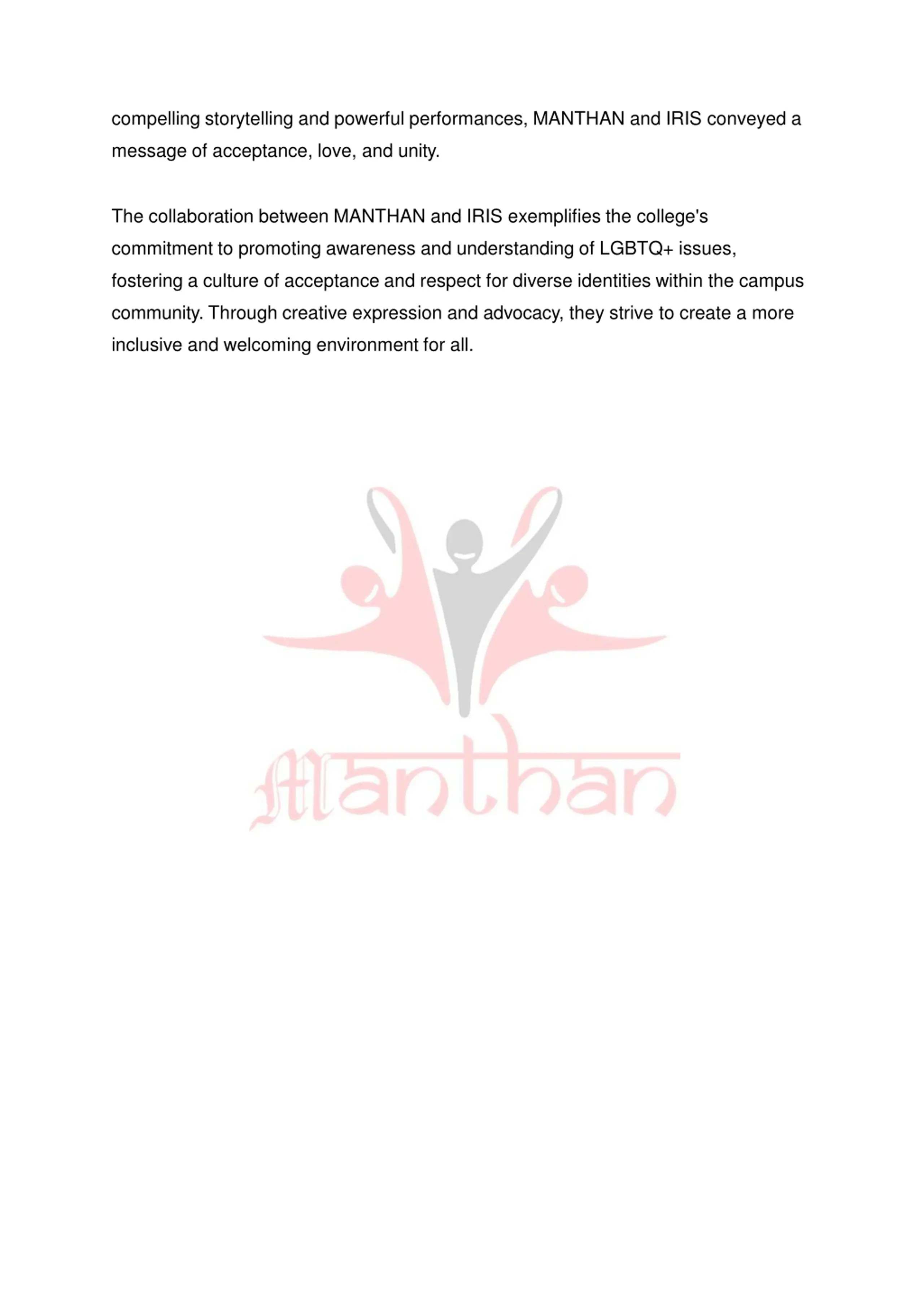 compelling storytelling and powerful performances, MANTHAN and IRIS conveyed a message of acceptance, love, and unity. The collaboration between MANTHAN and IRIS exemplifies the college's commitment to promoting awareness and understanding of LGBTQ+ issues, fostering a culture of acceptance and respect for diverse identities within the campus community. Through creative expression and advocacy, they strive to create a more inclusive and welcoming environment for all.