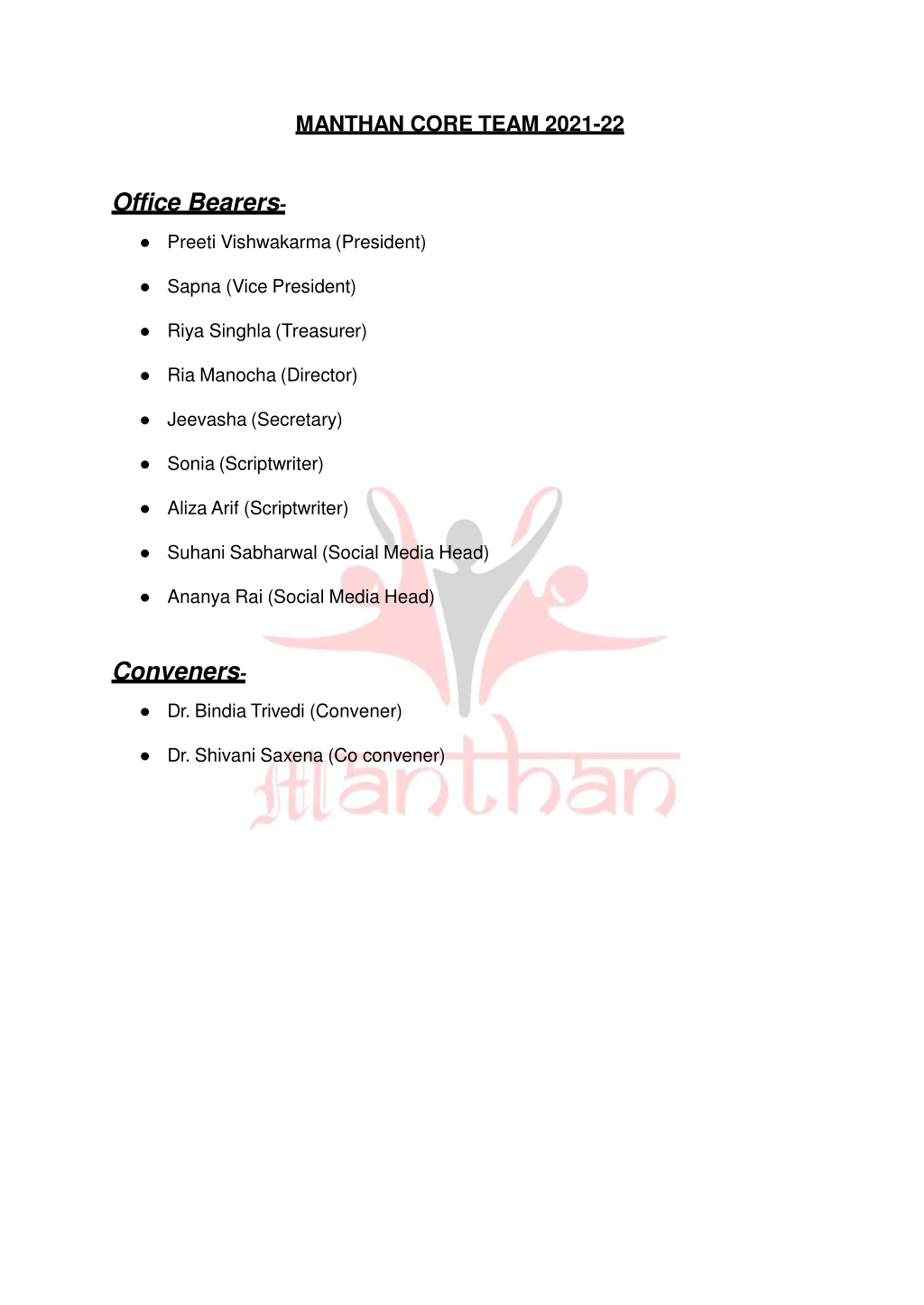 MANTHAN CORE TEAM 2021-22 Office Bearers- Preeti Vishwakarma (President) Sapna (Vice President) Riya Singhla (Treasurer) Ria Manocha (Director) Jeevasha (Secretary) Sonia (Scriptwriter) AlizaArif (Scriptwriter) Suhani Sabharwal (Social Media Head) Ananya Rai (Social Media Head) Conveners- Dr. Bindia Trivedi (Convener) Dr. Shivani Saxena (Co convener)