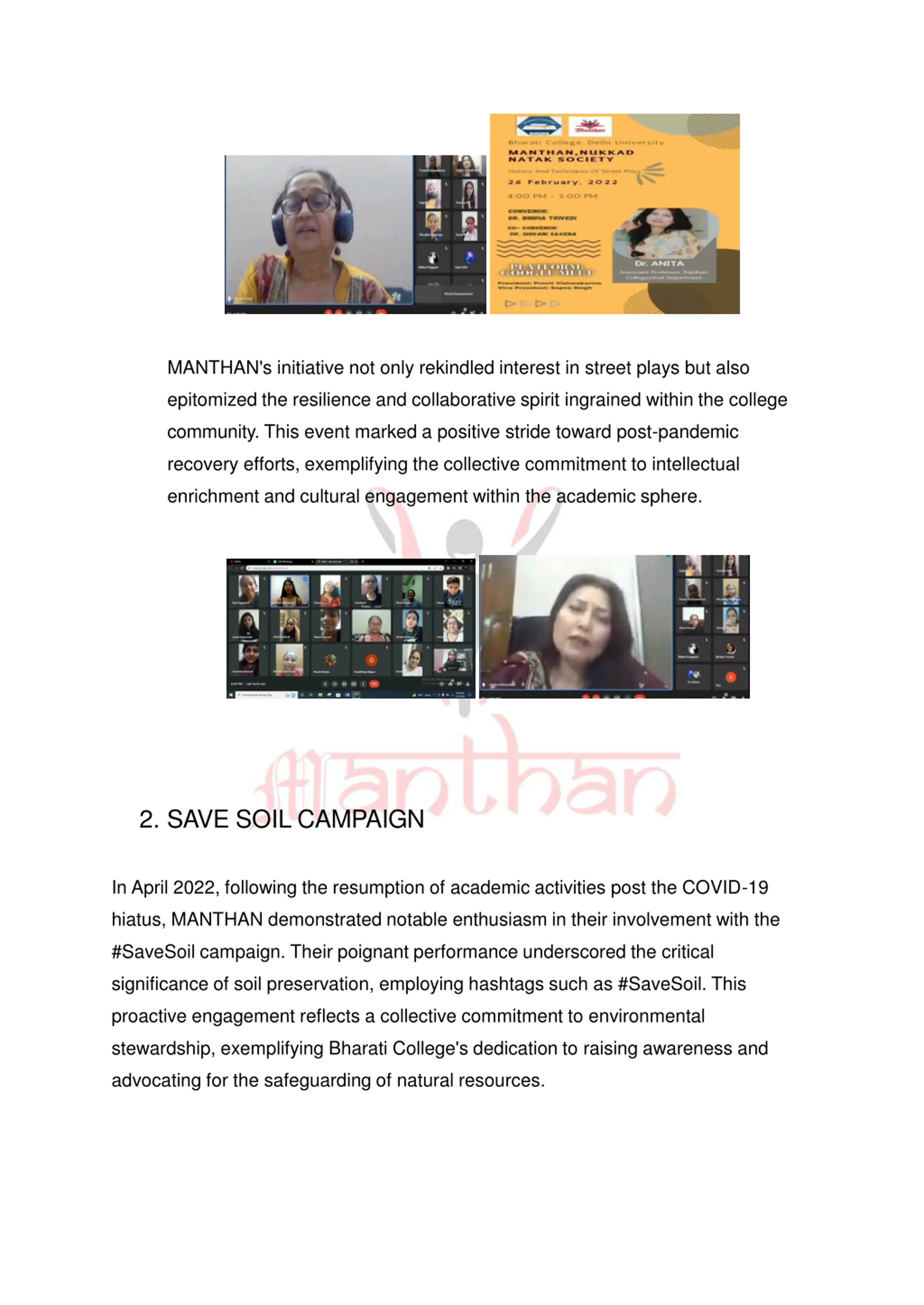 MANTHAN's initiative not only rekindled interest in street plays but also epitomized the resilience and collaborative spirit ingrained within the college community. This event marked a positive stride toward post-pandemic recovery efforts, exemplifying the collective commitment to intellectual enrichment and cultural engagement within the academic sphere. 2. SAVE SOIL CAMPAIGN In April 2022, following the resumption of academic activities post the COVID-19 hiatus, MANTHAN demonstrated notable enthusiasm in their involvement with the #SaveSoil campaign. Their poignant performance underscored the critical significance of soil preservation, employing hashtags such as #SaveSoil. This proactive engagement reflects a collective commitment to environmental stewardship, exemplifying Bharati College's dedication to raising awareness and advocating for the safeguarding of natural resources.