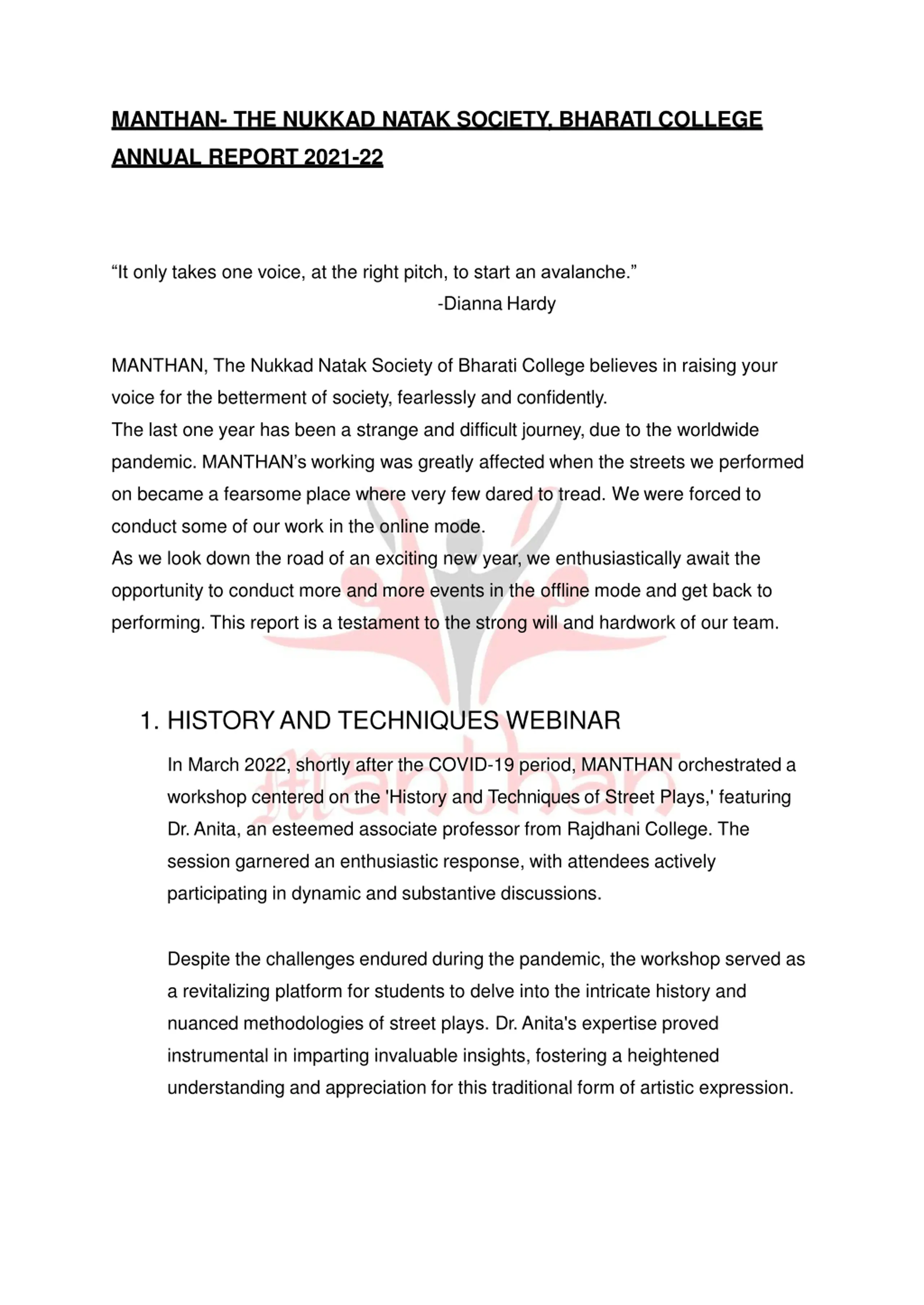 MANTHAN- THE NUKKAD NATAK SOCIETY, BHARATI COLLEGE ANNUAL REPORT 2021-22 It only takes one voice, at the right pitch, to start an avalanche. -Dianna Hardy MANTHAN, The Nukkad Natak Society of Bharati College believes in raising your voice for the betterment of society, fearlessly and confidently. The last one year has been a strange and difficult journey, due to the worldwide pandemic. MANTHAN s working was greatly affected when the streets we performed on became a fearsome place where very few dared to tread. We were forced to conduct some of our work in the online mode. As we look down the road of an exciting new year, we enthusiastically await the opportunity to conduct more and more events in the offline mode and get back to performing. This report is a testament to the strong will and hardwork of our team. 1. HISTORY AND TECHNIQUES WEBINAR In March 2022, shortly after the COVID-19 period, MANTHAN orchestrated a workshop centered on the 'History and Techniques of Street Plays,' featuring Dr. Anita, an esteemed associate professor from Rajdhani College. The session garnered an enthusiastic response, with attendees actively participating in dynamic and substantive discussions. Despite the challenges endured during the pandemic, the workshop served as a revitalizing platform for students to delve into the intricate history and nuanced methodologies of street plays. Dr. Anita's expertise proved instrumental in imparting invaluable insights, fostering a heightened understanding and appreciation for this traditional form of artistic expression.