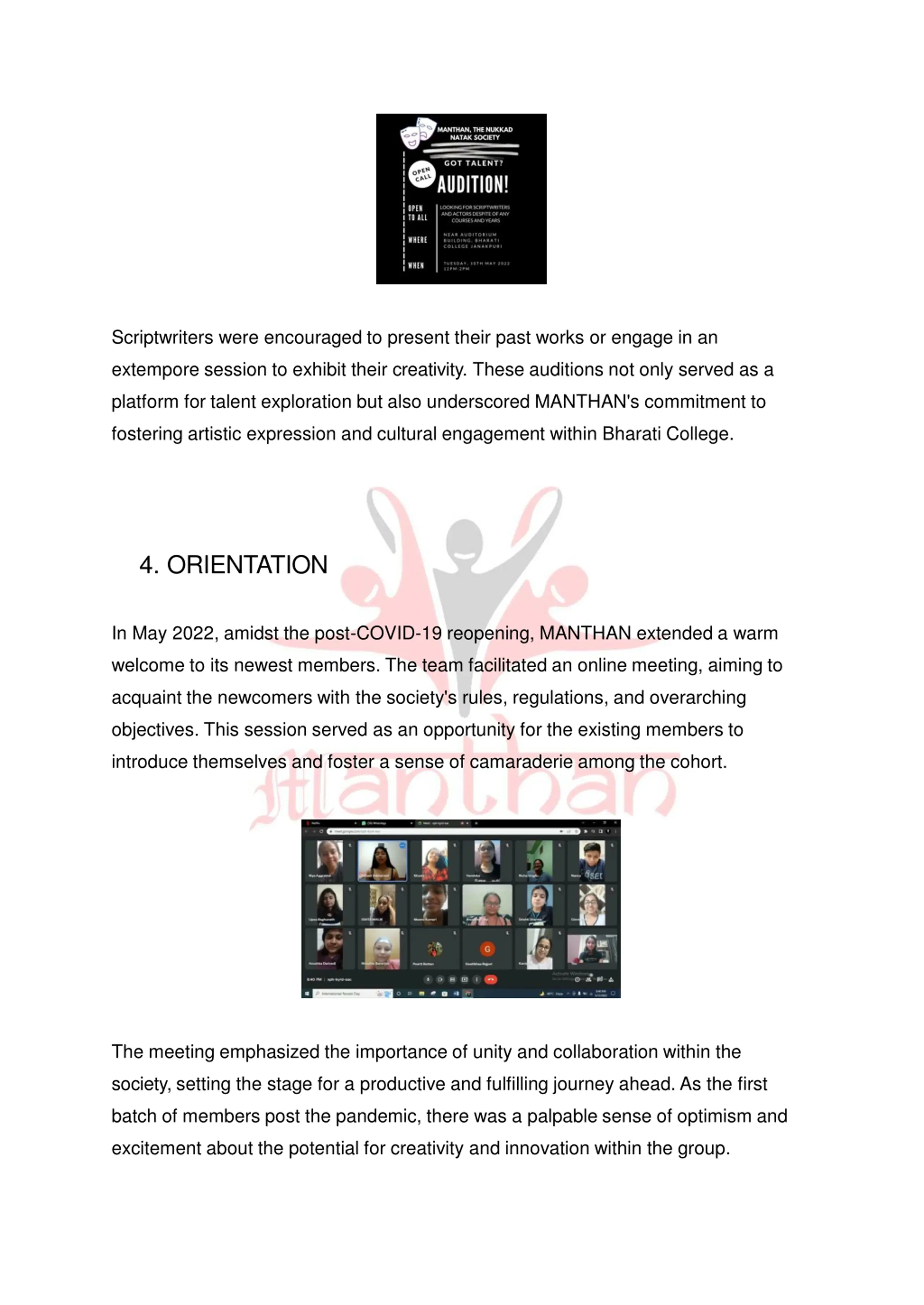 Scriptwriters were encouraged to present their past works or engage in an extempore session to exhibit their creativity. These auditions not only served as a platform for talent exploration but also underscored MANTHAN's commitment to fostering artistic expression and cultural engagement within Bharati College. 4. ORIENTATION In May 2022, amidst the post-COVID-19 reopening, MANTHAN extended a warm welcome to its newest members. The team facilitated an online meeting, aiming to acquaint the newcomers with the society's rules, regulations, and overarching objectives. This session served as an opportunity for the existing members to introduce themselves and foster a sense of camaraderie among the cohort. The meeting emphasized the importance of unity and collaboration within the society, setting the stage for a productive and fulfilling journey ahead. As the first batch of members post the pandemic, there was a palpable sense of optimism and excitement about the potential for creativity and innovation within the group.