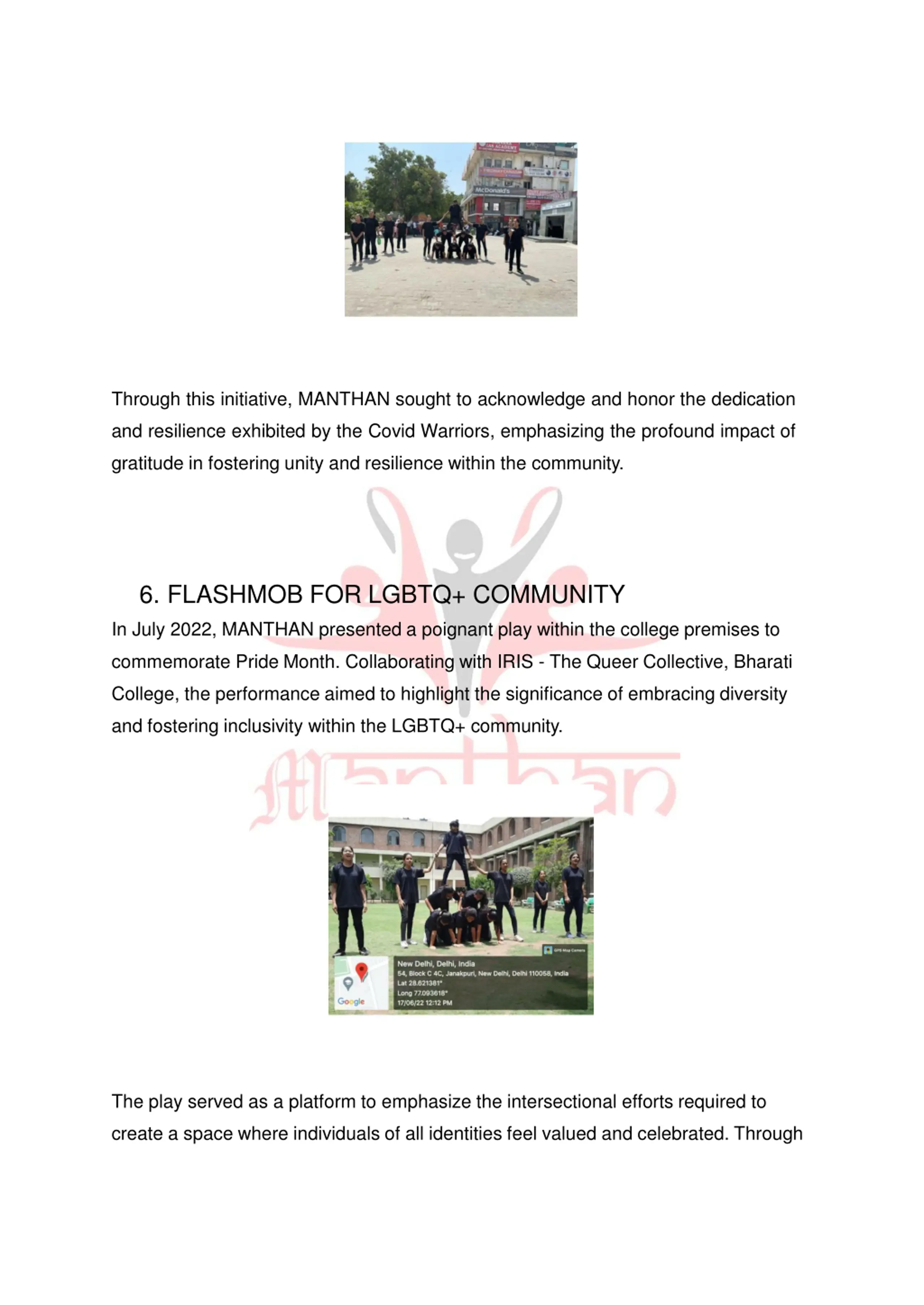 Through this initiative, MANTHAN sought to acknowledge and honor the dedication and resilience exhibited by the Covid Warriors, emphasizing the profound impact of gratitude in fostering unity and resilience within the community. 6. FLASHMOB FOR LGBTQ+ COMMUNITY In July 2022, MANTHAN presented a poignant play within the college premises to commemorate Pride Month. Collaborating with IRIS - The Queer Collective, Bharati College, the performance aimed to highlight the significance of embracing diversity and fostering inclusivity within the LGBTQ+ community. The play served as a platform to emphasize the intersectional efforts required to create a space where individuals of all identities feel valued and celebrated. Through