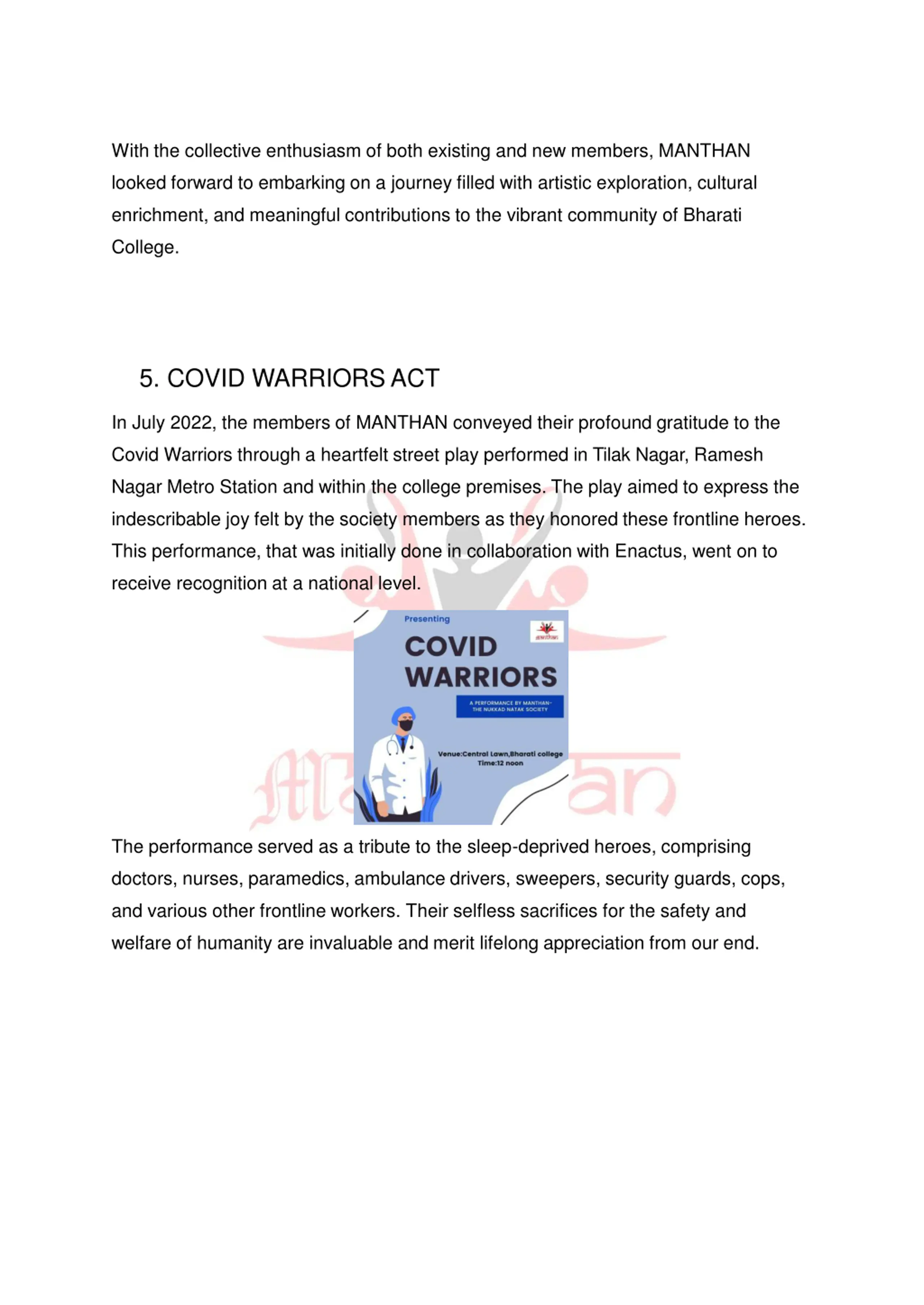 With the collective enthusiasm of both existing and new members, MANTHAN looked forward to embarking on a journey filled with artistic exploration, cultural enrichment, and meaningful contributions to the vibrant community of Bharati College. 5. COVID WARRIORS ACT In July 2022, the members of MANTHAN conveyed their profound gratitude to the Covid Warriors through a heartfelt street play performed in Tilak Nagar, Ramesh Nagar Metro Station and within the college premises. The play aimed to express the indescribable joy felt by the society members as they honored these frontline heroes. This performance, that was initially done in collaboration with Enactus, went on to receive recognition at a national level. The performance served as a tribute to the sleep-deprived heroes, comprising doctors, nurses, paramedics, ambulance drivers, sweepers, security guards, cops, and various other frontline workers. Their selfless sacrifices for the safety and welfare of humanity are invaluable and merit lifelong appreciation from our end.