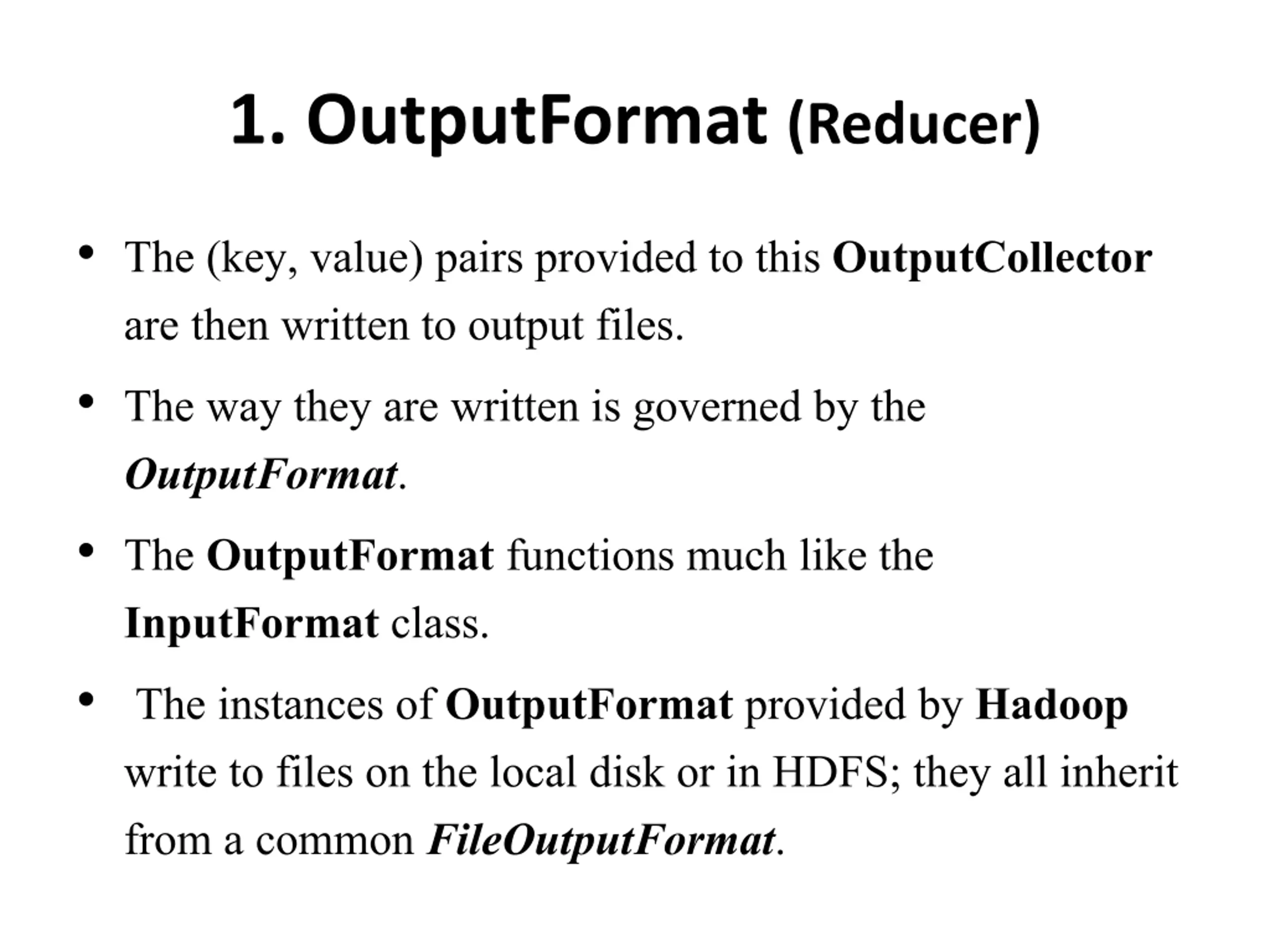 1. OutputFormat (Reducer) The (key, value) pairs provided to this OutputCollector are then written to output files. The way they are written is governed by the OutputFormat. The OutputFormat functions much like the InputFormat class. The instances of OutputFormat provided by Hadoop write to files on the local disk or in HDFS; they all inherit from a common FileOutputFormat.