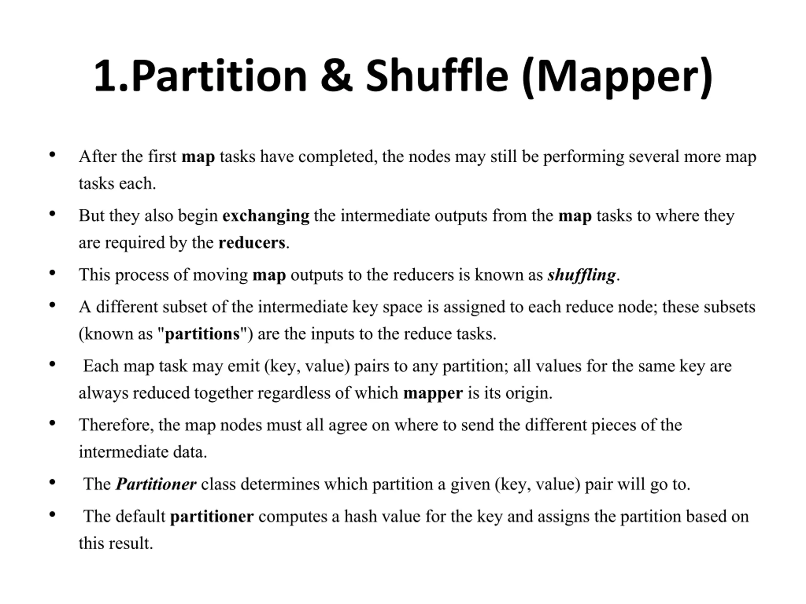 1.Partition & Shuffle (Mapper) After the first maptasks have completed, the nodes may still be performing several more map tasks each. But they also begin exchangingthe intermediate outputs from the maptasks to where they are required by the reducers. This process of moving mapoutputs to the reducers is known as shuffling. A different subset of the intermediate key space is assigned to each reduce node; these subsets (known as "partitions") are the inputs to the reduce tasks. Each map task may emit (key, value) pairs to any partition; all values for the same key are always reduced together regardless of which mapperis its origin. Therefore, the map nodes must all agree on where to send the different pieces of the intermediate data. The Partitioner class determines which partition a given (key, value) pair will go to. The default partitionercomputes a hash value for the key and assigns the partition based on this result.