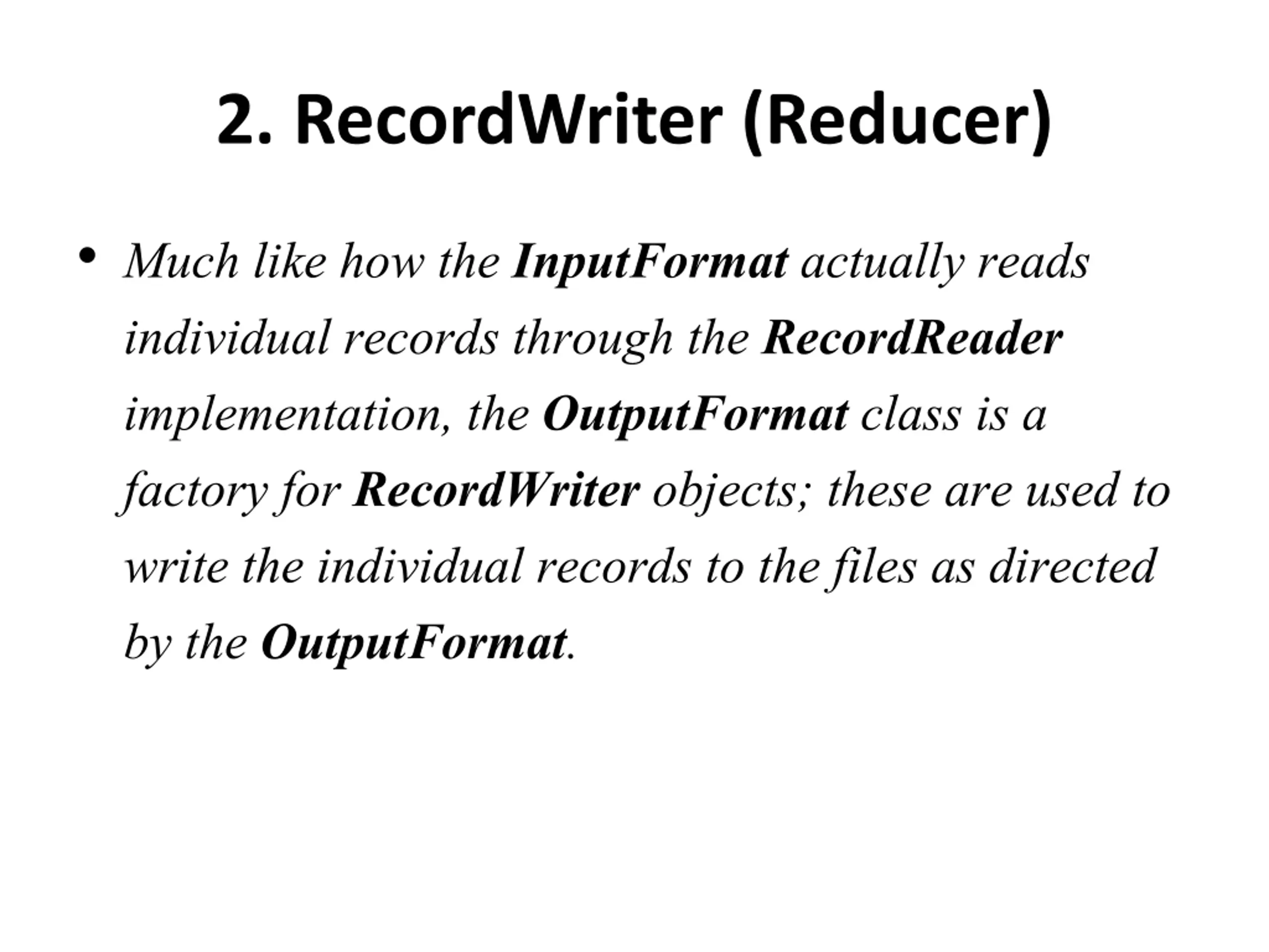 2. RecordWriter (Reducer) Much like how the InputFormatactually reads individual records through the RecordReader implementation, the OutputFormatclass is a factory for RecordWriterobjects; these are used to write the individual records to the files as directed by the OutputFormat.