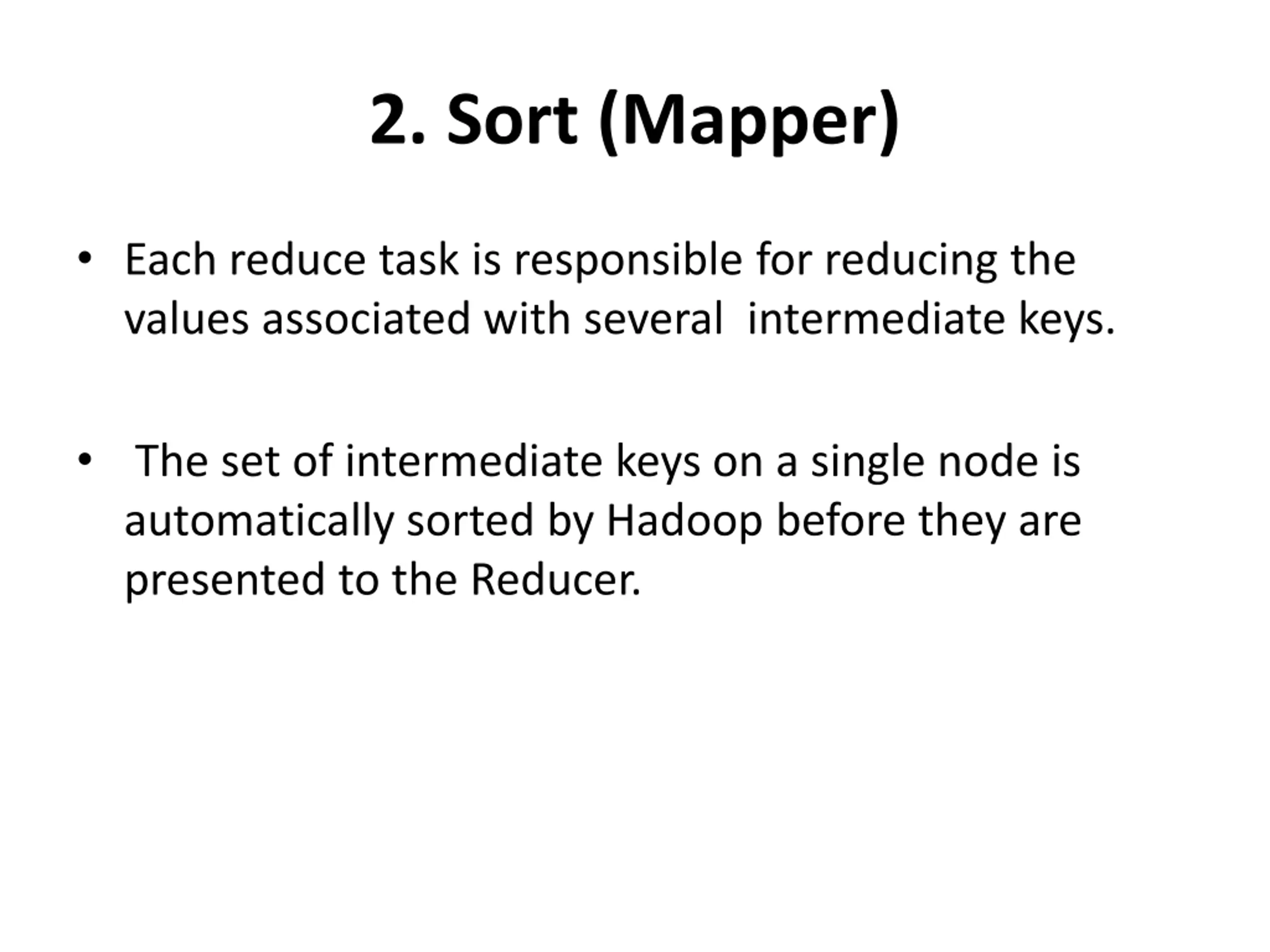 2. Sort (Mapper) Each reduce task is responsible for reducing the values associated with several intermediate keys. The set of intermediate keys on a single node is automatically sorted by Hadoop before they are presented to the Reducer.