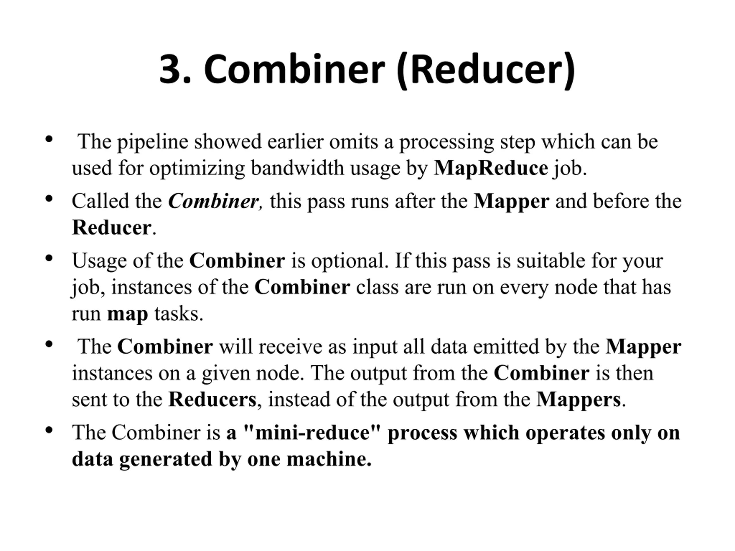 3. Combiner (Reducer) The pipeline showed earlier omits a processing step which can be used for optimizing bandwidth usage by MapReducejob. Called the Combiner,this pass runs after the Mapperand before the Reducer. Usage of the Combiner is optional. If this pass is suitable for your job, instances of the Combinerclass are run on every node that has run map tasks. The Combinerwill receive as input all data emitted by the Mapper instances on a given node. The output from the Combineris then sent to the Reducers, instead of the output from the Mappers. The Combiner is a "mini-reduce" process which operates only on data generated by one machine.