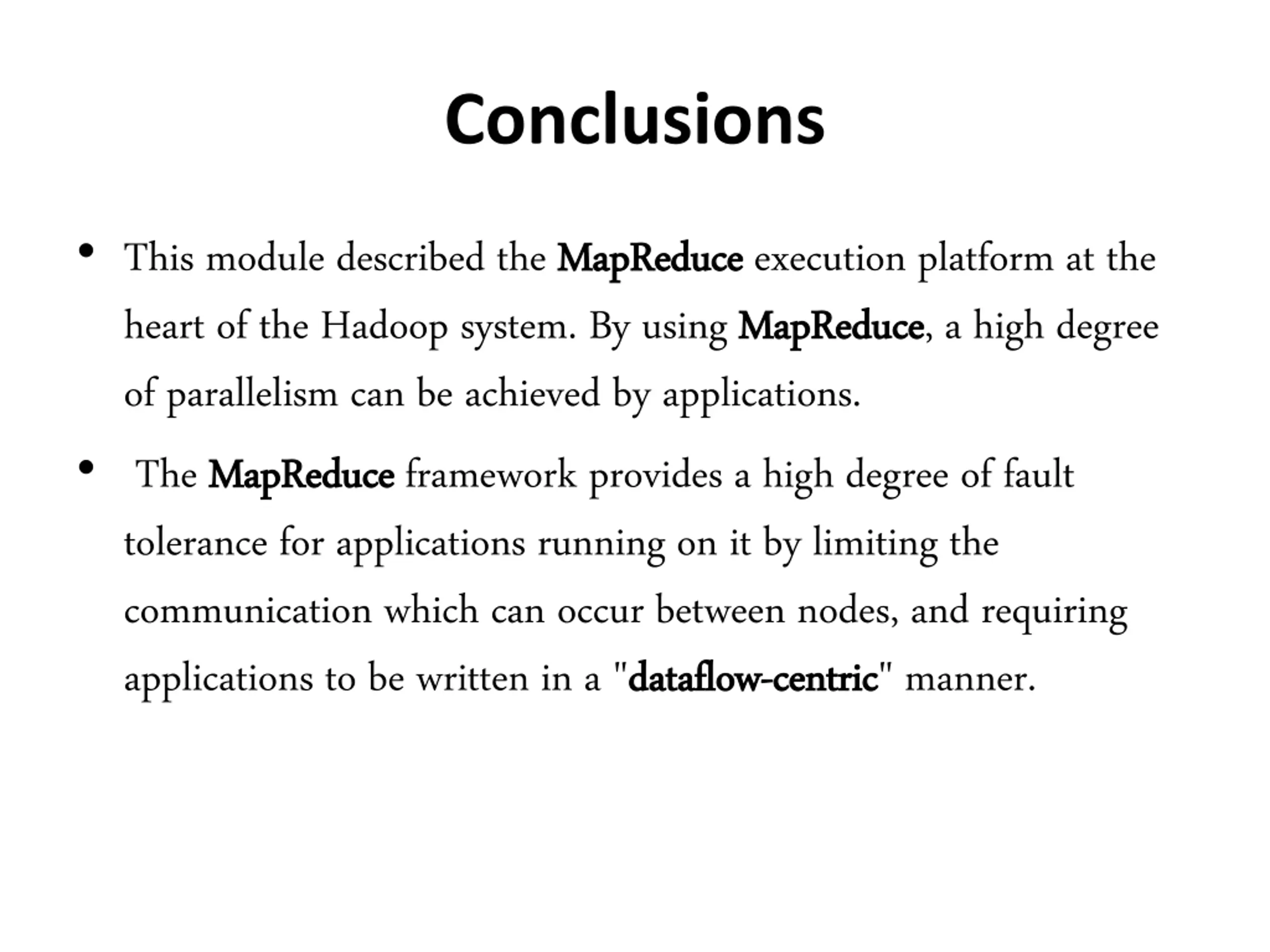 Conclusions This module described the MapReduce heart of the Hadoop system. By using MapReduce of parallelism can be achieved by applications. The MapReduce MapReduceframework provides a high degree of fault tolerance for applications running on it by limiting the communication which can occur between nodes, and requiring applications to be written in a "dataflow MapReduceexecution platform at the MapReduce, a high degree dataflow- -centric centric" manner.