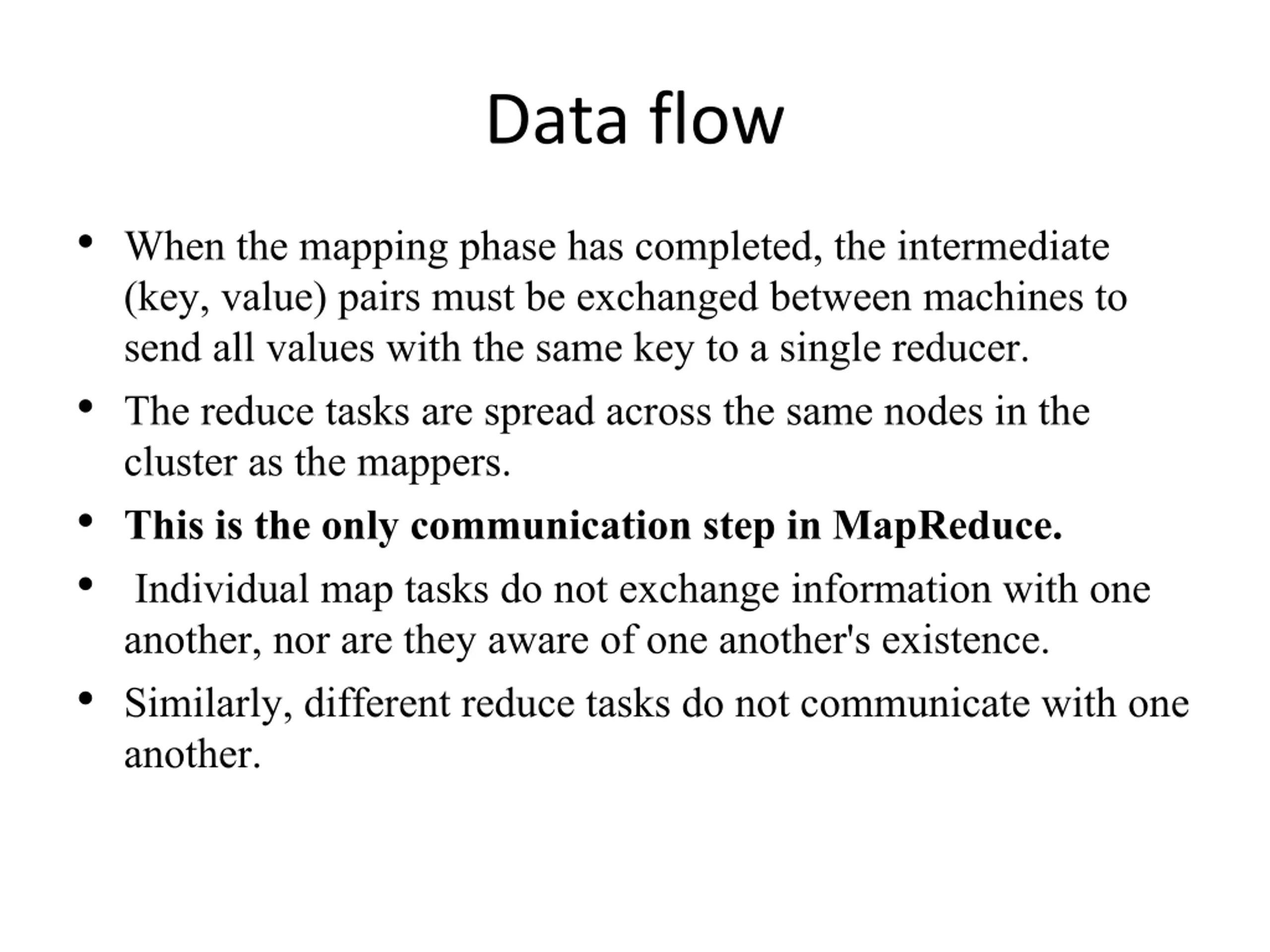 Data flow When the mapping phase has completed, the intermediate (key, value) pairs must be exchanged between machines to send all values with the same key to a single reducer. The reduce tasks are spread across the same nodes in the cluster as the mappers. This is the only communication step in MapReduce. Individual map tasks do not exchange information with one another, nor are they aware of one another's existence. Similarly, different reduce tasks do not communicate with one another.