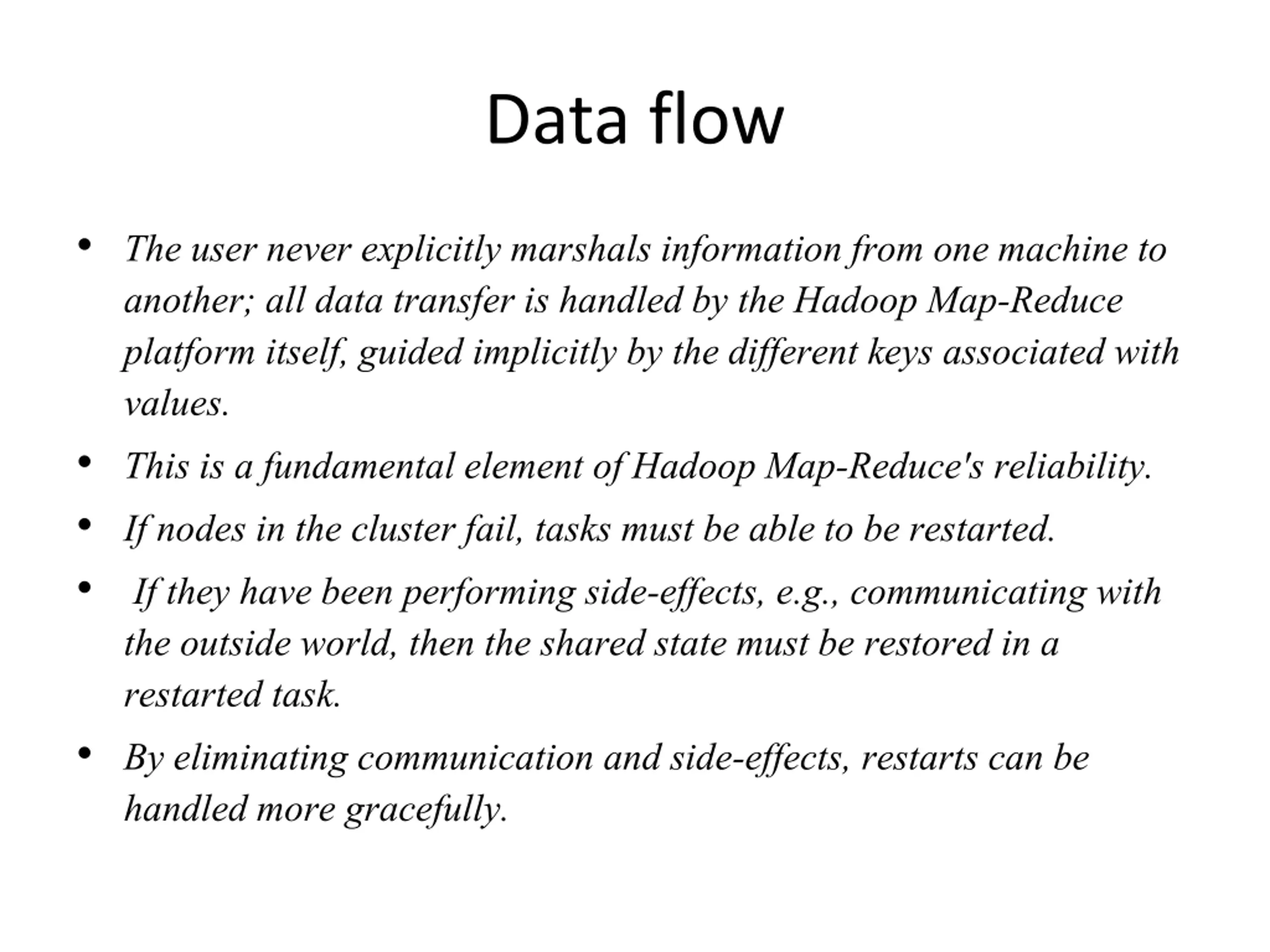 Data flow The user never explicitly marshals information from one machine to another; all data transfer is handled by the HadoopMap-Reduce platform itself, guided implicitly by the different keys associated with values. This is a fundamental element of HadoopMap-Reduce'sreliability. If nodes in the cluster fail, tasks must be able to be restarted. If they have been performing side-effects, e.g., communicating with the outside world, then the shared state must be restored in a restarted task. By eliminating communication and side-effects, restarts can be handled more gracefully.