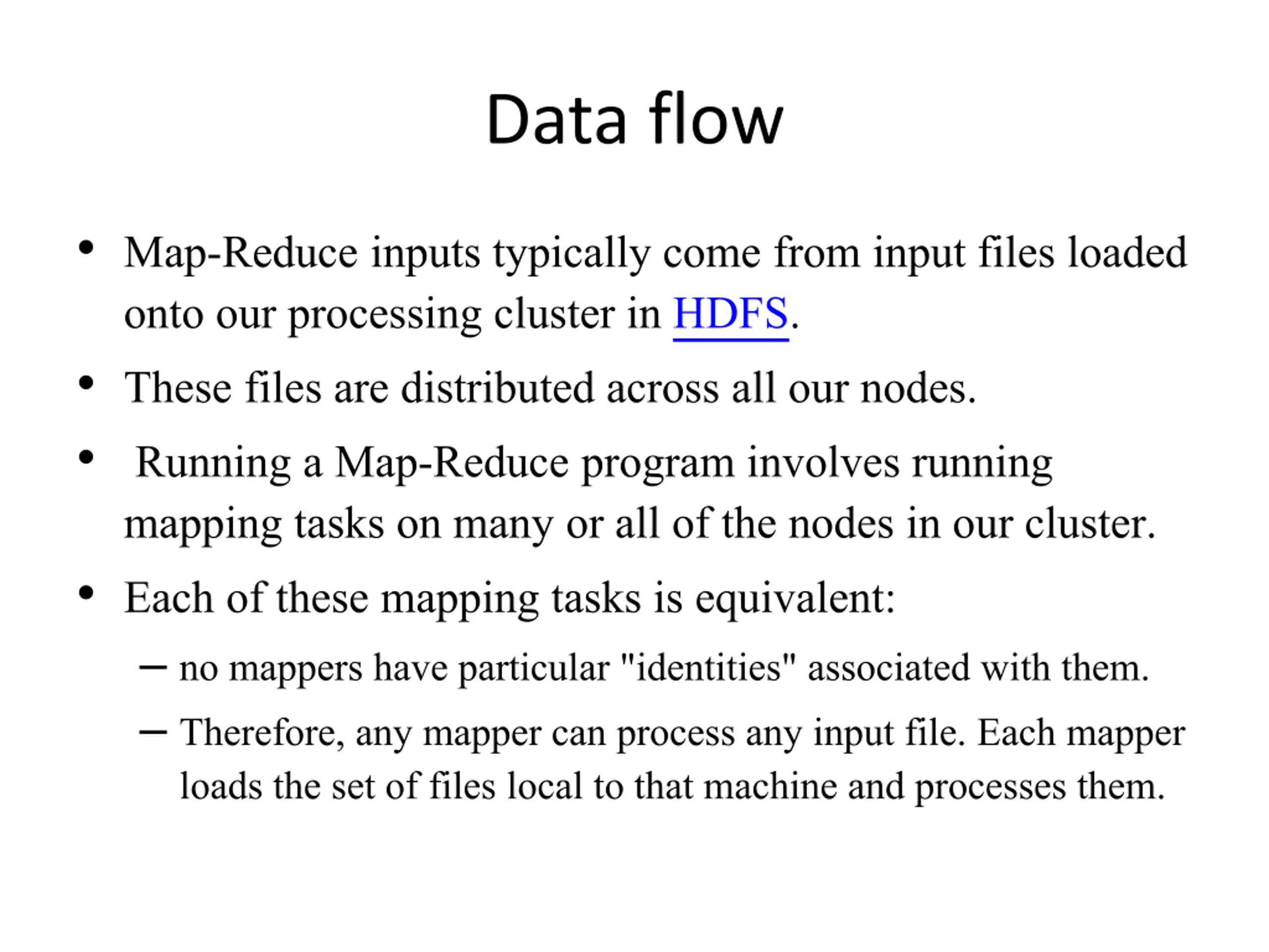 Data flow Map-Reduce inputs typically come from input files loaded onto our processing cluster in HDFS. These files are distributed across all our nodes. Running a Map-Reduce program involves running mapping tasks on many or all of the nodes in our cluster. Each of these mapping tasks is equivalent: no mappers have particular "identities" associated with them. Therefore, any mappercan process any input file. Each mapper loads the set of files local to that machine and processes them.