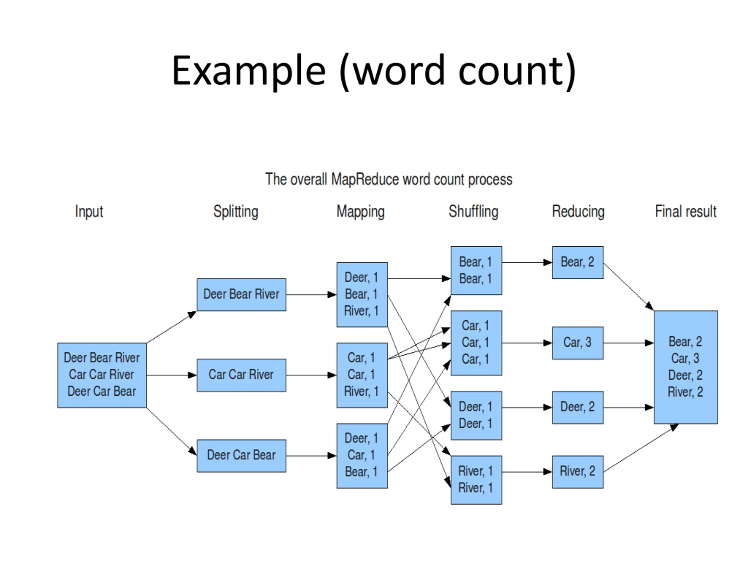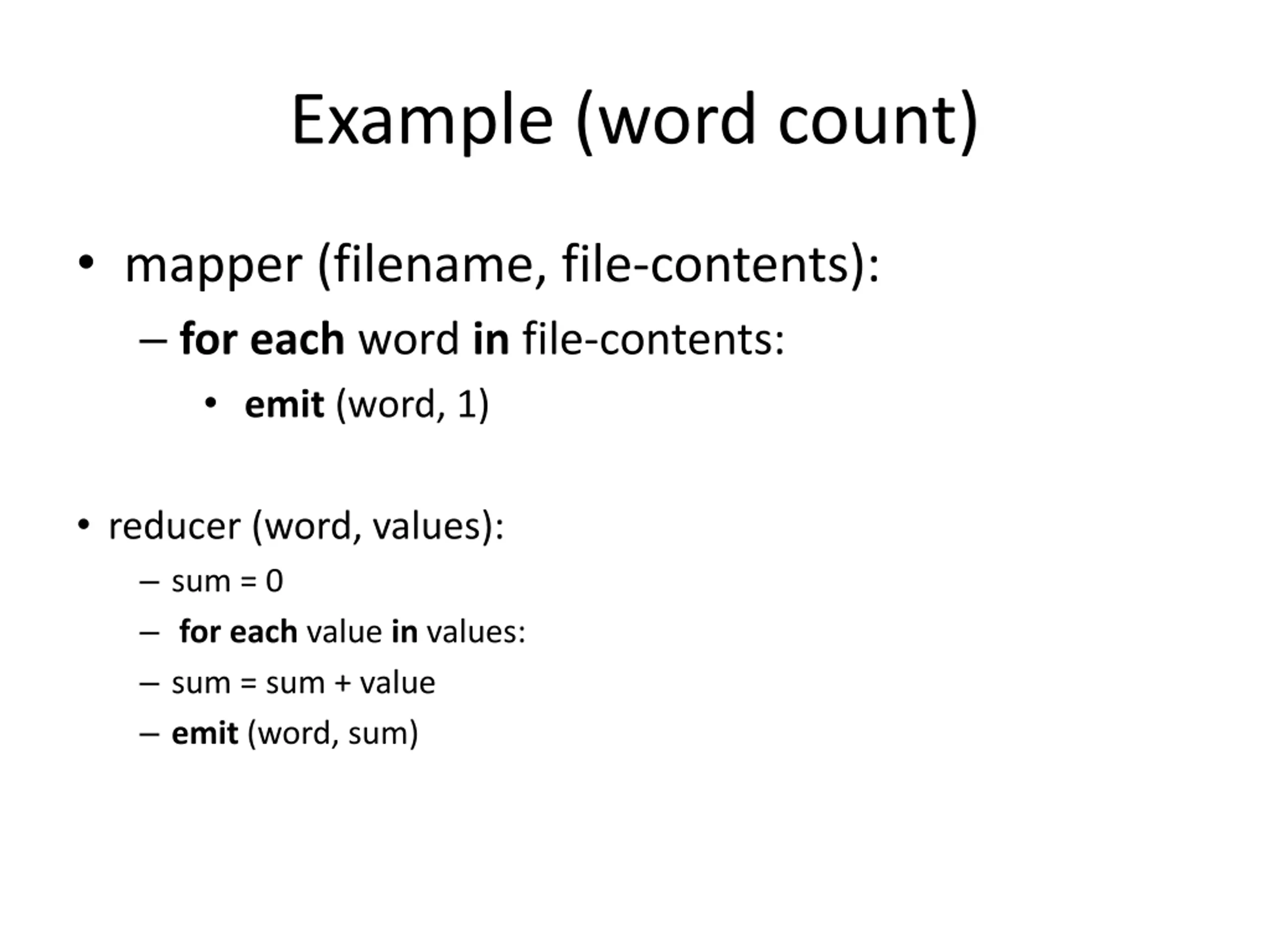 Example (word count) mapper (filename, file-contents): for each word in file-contents: emit (word, 1) reducer (word, values): sum = 0 for each value in values: sum = sum + value emit (word, sum)
