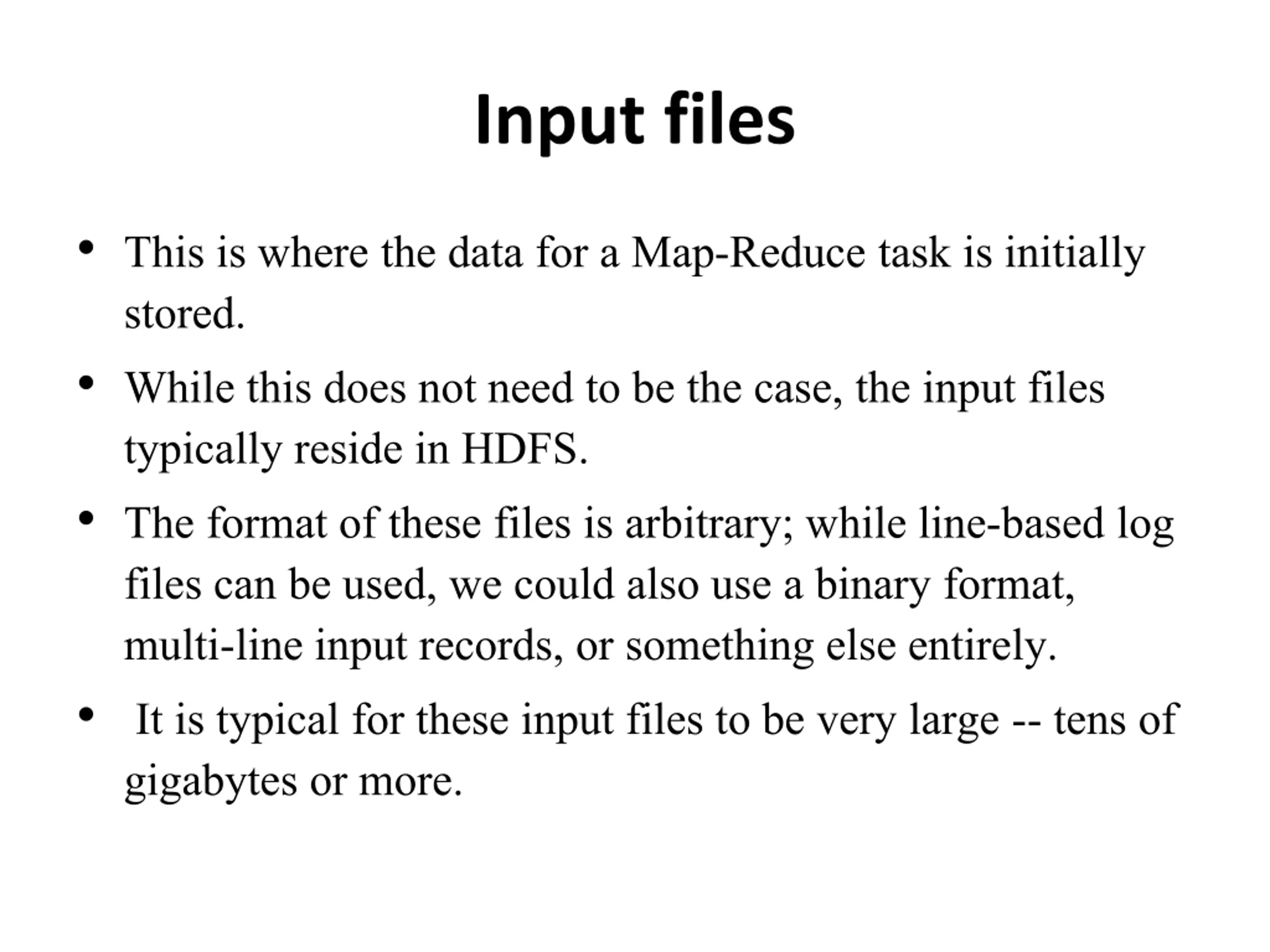 Input files This is where the data for a Map-Reduce task is initially stored. While this does not need to be the case, the input files typically reside in HDFS. The format of these files is arbitrary; while line-based log files can be used, we could also use a binary format, multi-line input records, or something else entirely. It is typical for these input files to be very large -- tens of gigabytes or more.