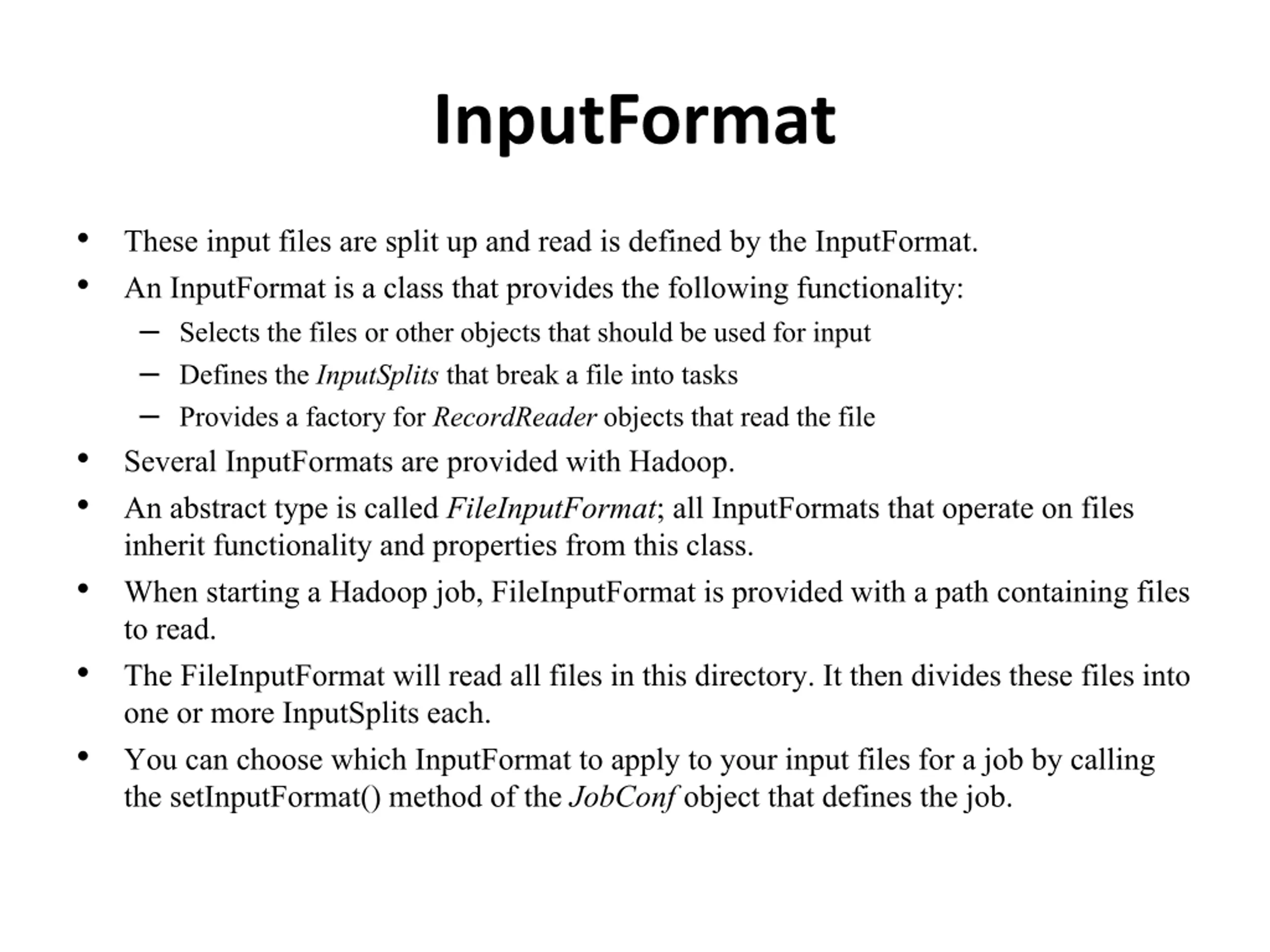 InputFormat These input files are split up and read is defined by the InputFormat. An InputFormatis a class that provides the following functionality: Selects the files or other objects that should be used for input Defines the InputSplitsthat break a file into tasks Provides a factory for RecordReaderobjects that read the file Several InputFormatsare provided with Hadoop. An abstract type is called FileInputFormat; all InputFormatsthat operate on files inherit functionality and properties from this class. When starting a Hadoop job, FileInputFormat is provided with a path containing files to read. The FileInputFormatwill read all files in this directory. It then divides these files into one or more InputSplitseach. You can choose which InputFormatto apply to your input files for a job by calling the setInputFormat() method of the JobConf object that defines the job.