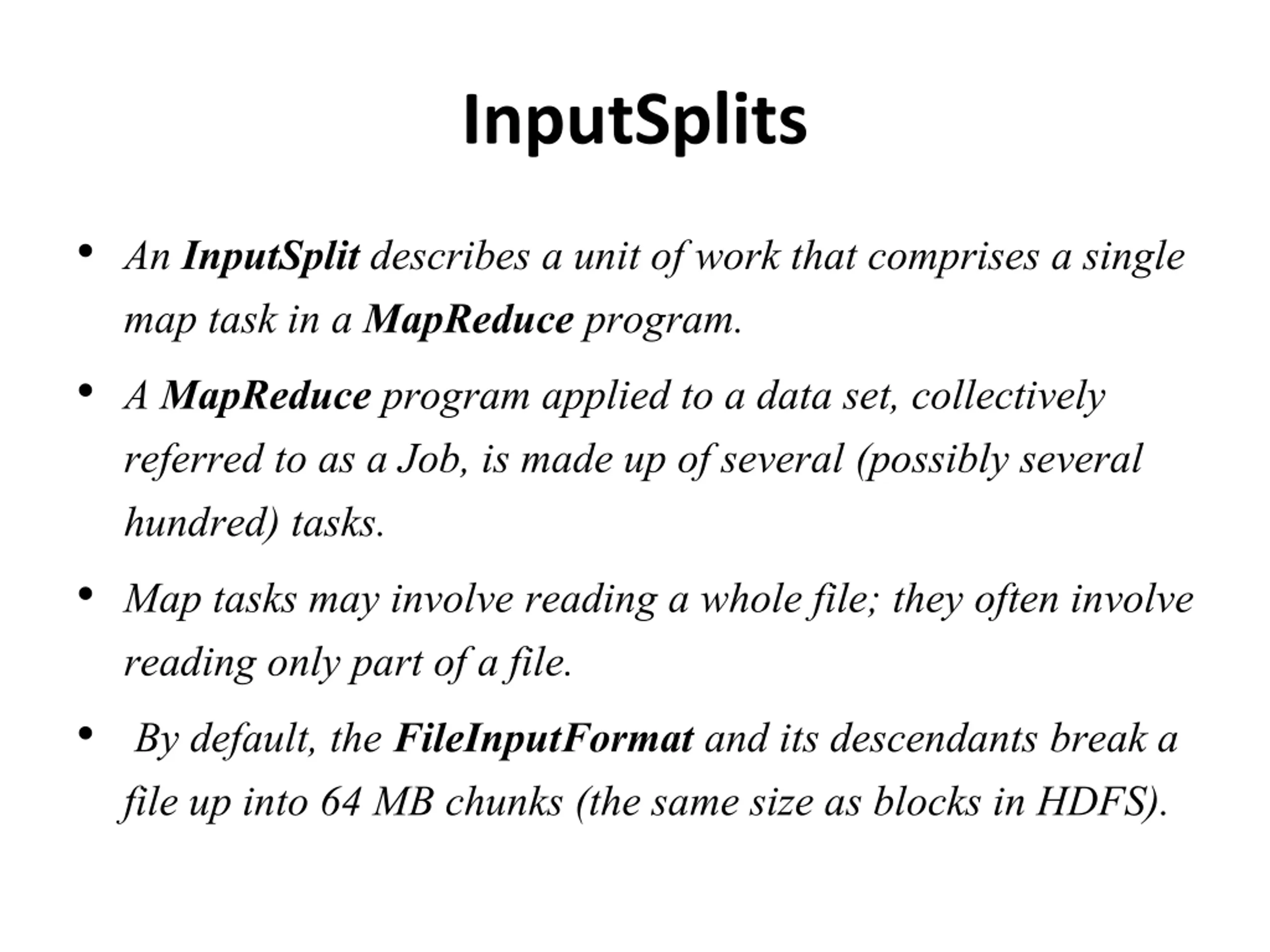 InputSplits An InputSplit describes a unit of work that comprises a single map task in a MapReduce program. A MapReduce program applied to a data set, collectively referred to as a Job, is made up of several (possibly several hundred) tasks. Map tasks may involve reading a whole file; they often involve reading only part of a file. By default, the FileInputFormat and its descendants break a file up into 64 MB chunks (the same size as blocks in HDFS).
