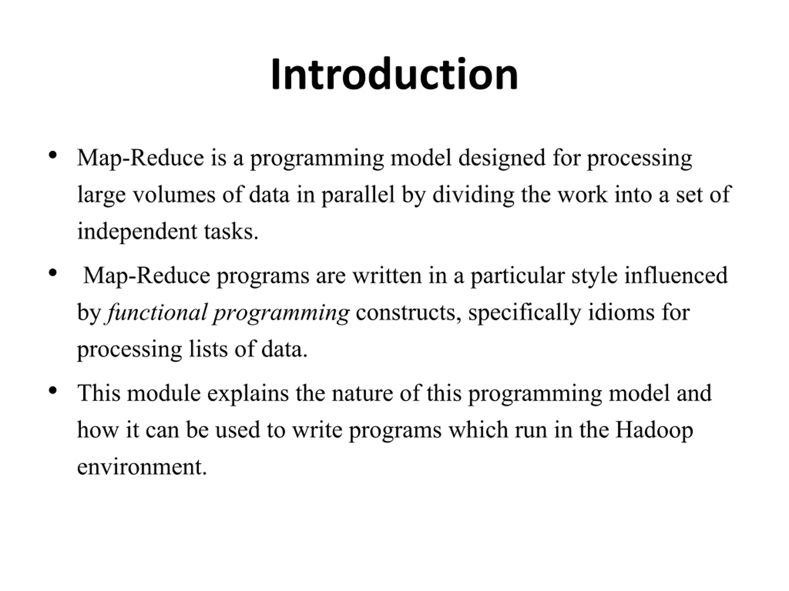 Introduction Map-Reduce is a programming model designed for processing large volumes of data in parallel by dividing the work into a set of independent tasks. Map-Reduce programs are written in a particular style influenced by functional programmingconstructs, specifically idioms for processing lists of data. This module explains the nature of this programming model and how it can be used to write programs which run in the Hadoop environment.