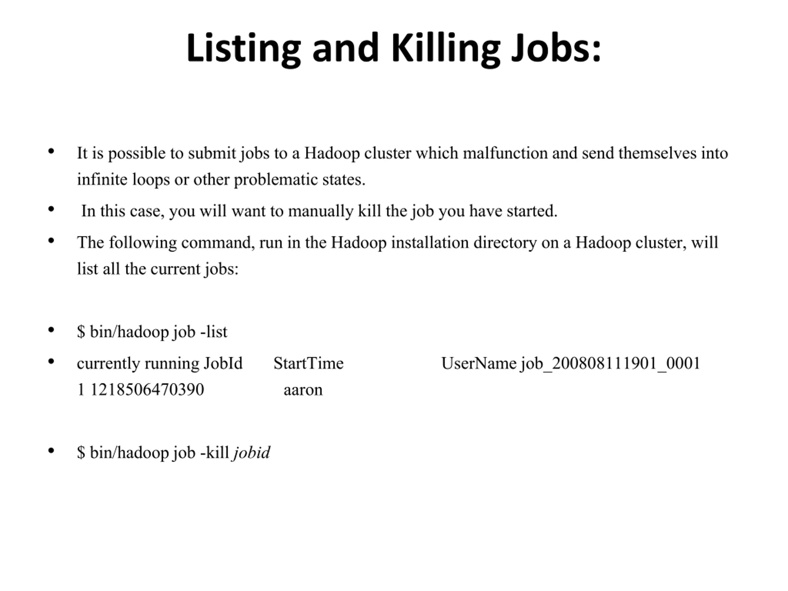 Listing and Killing Jobs: It is possible to submit jobs to a Hadoopcluster which malfunction and send themselves into infinite loops or other problematic states. In this case, you will want to manually kill the job you have started. The following command, run in the Hadoopinstallation directory on a Hadoopcluster, will list all the current jobs: $ bin/hadoopjob -list currently running JobId 1 1218506470390 StartTime aaron UserNamejob_200808111901_0001 $ bin/hadoopjob -kill jobid
