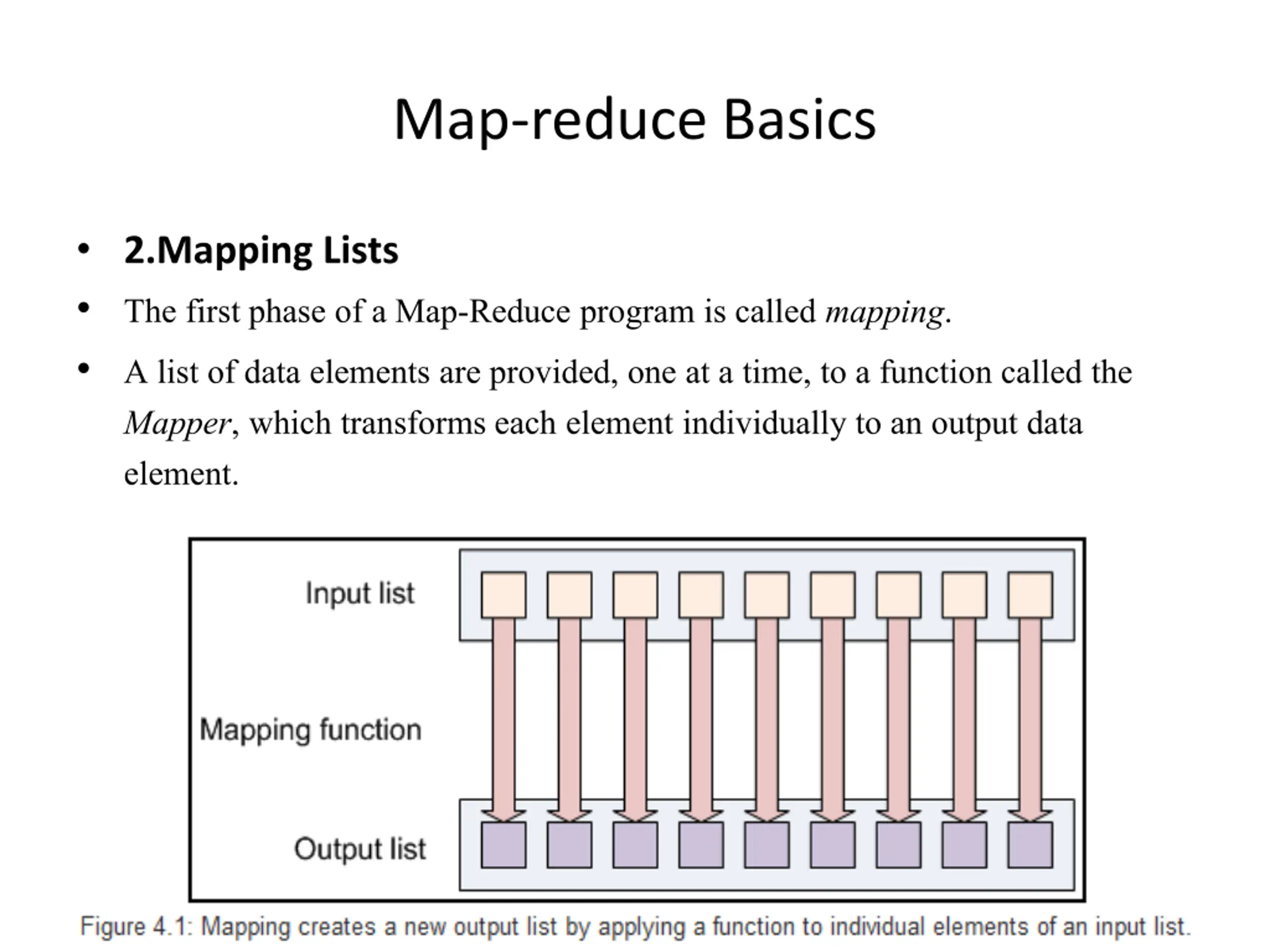 Map-reduce Basics 2.Mapping Lists The first phase of a Map-Reduce program is called mapping. A list of data elements are provided, one at a time, to a function called the Mapper, which transforms each element individually to an output data element.