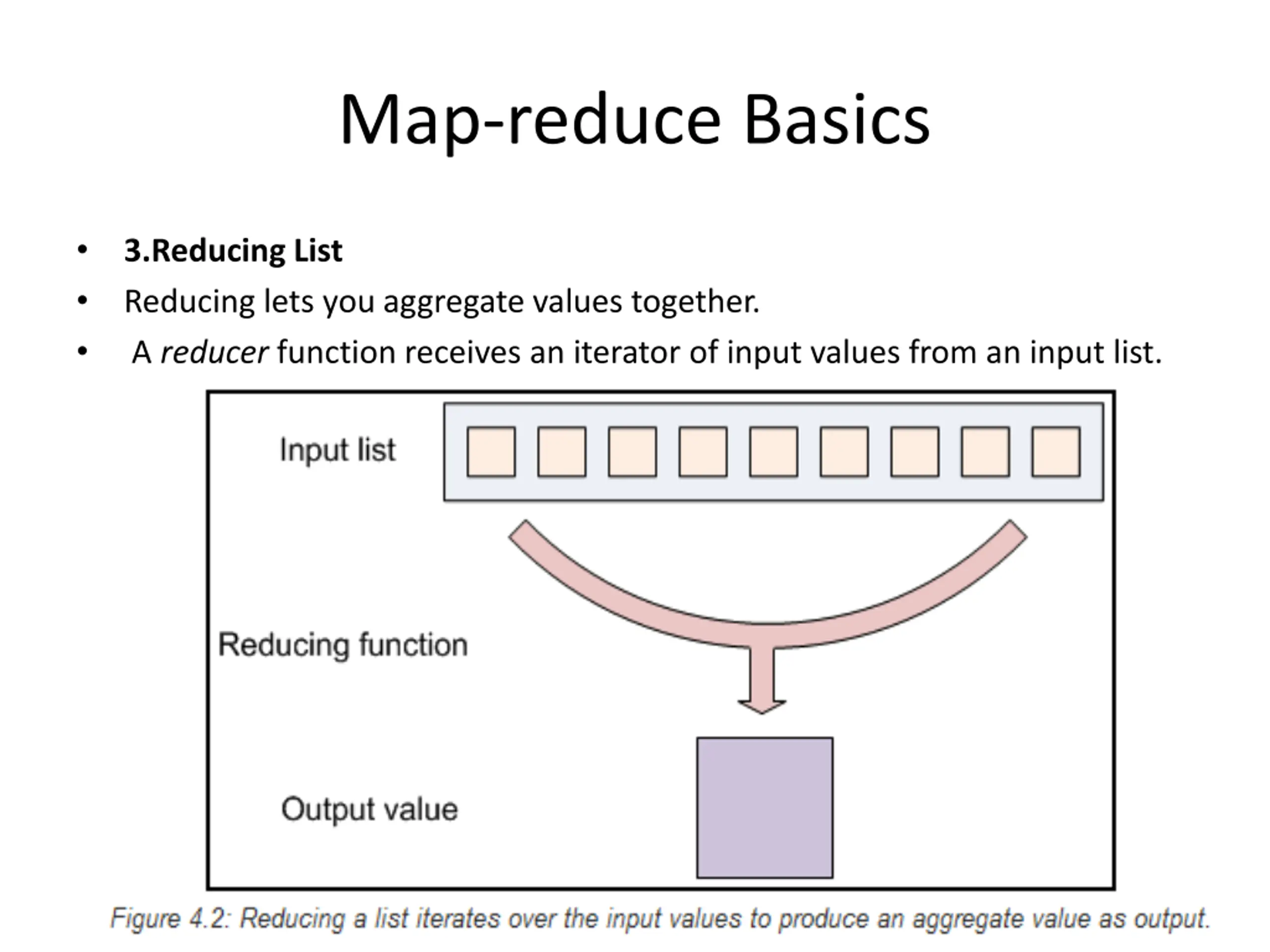 Map-reduce Basics 3.Reducing List Reducing lets you aggregate values together. A reducer function receives an iterator of input values from an input list. It then combines these values together, returning a single output value.
