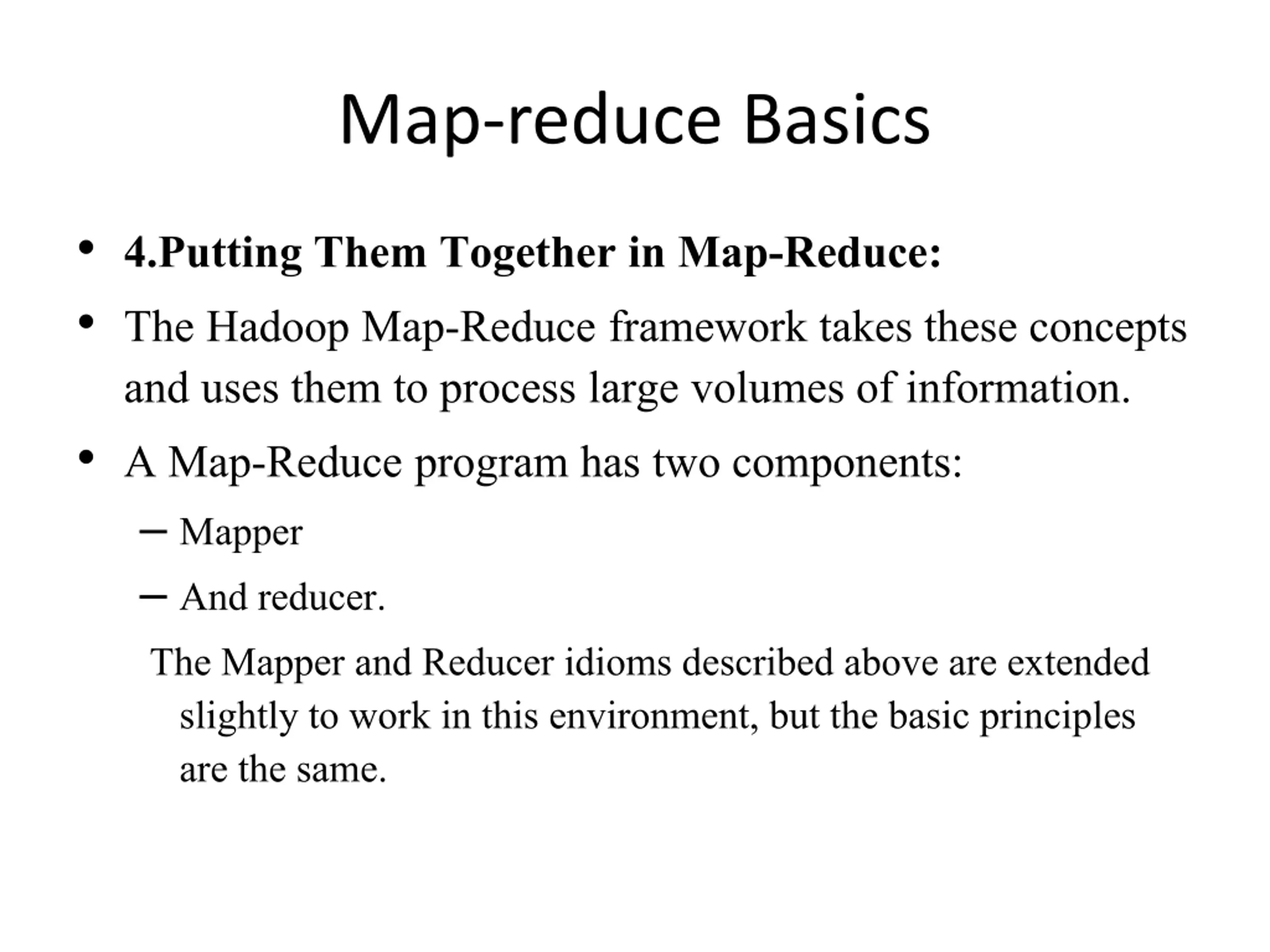 Map-reduce Basics 4.Putting Them Together in Map-Reduce: The Hadoop Map-Reduce framework takes these concepts and uses them to process large volumes of information. A Map-Reduce program has two components: Mapper And reducer. The Mapper and Reducer idioms described above are extended slightly to work in this environment, but the basic principles are the same.