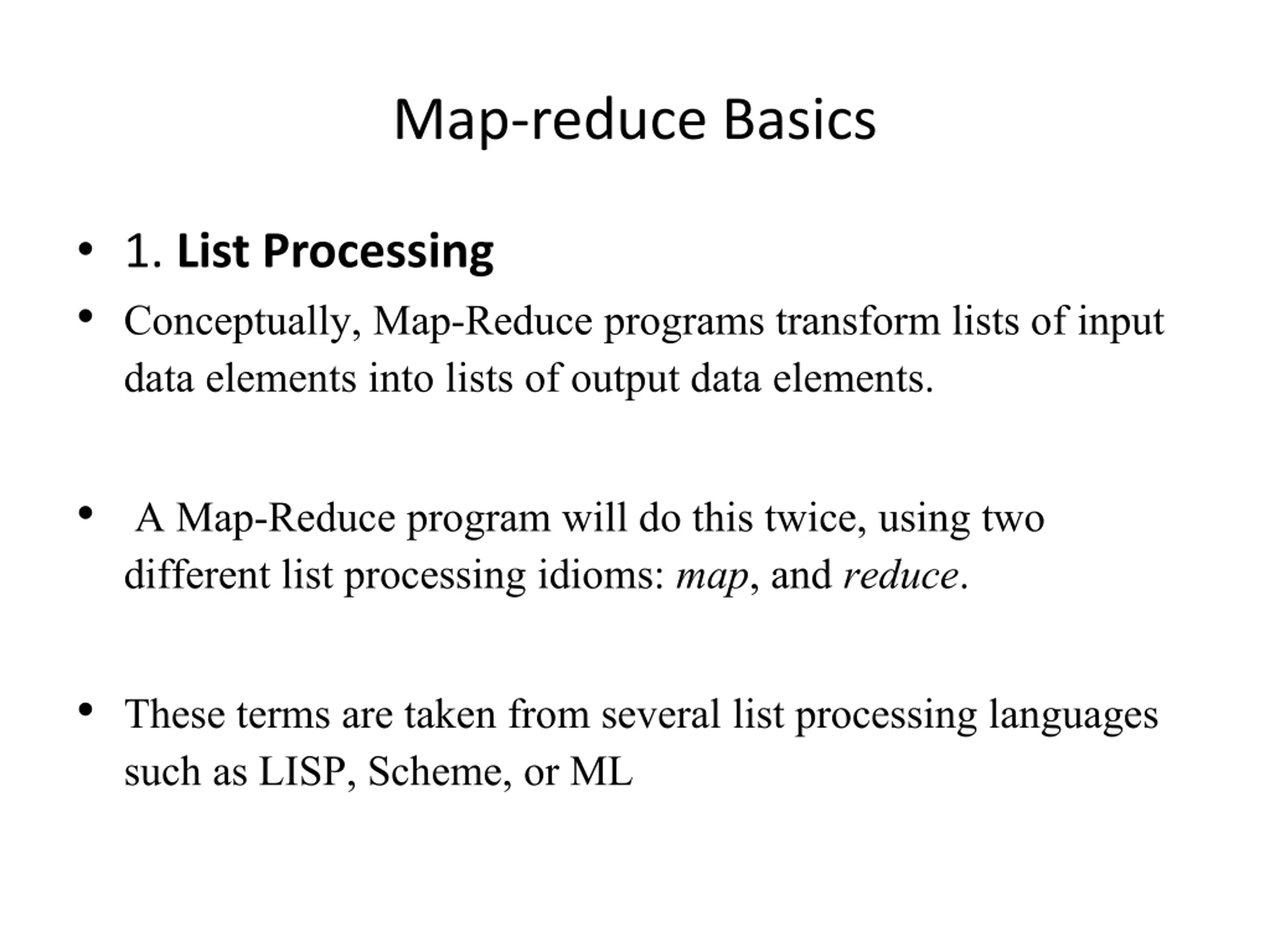 Map-reduce Basics 1. List Processing Conceptually, Map-Reduce programs transform lists of input data elements into lists of output data elements. A Map-Reduce program will do this twice, using two different list processing idioms: map, and reduce. These terms are taken from several list processing languages such as LISP, Scheme, or ML